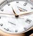 Mặt số khảm xà cừ trắng & đính 12 viên kim cương Top Wesselton VS-SI diamonds, tổng số 0.034 carats. Bộ máy Longines Caliber L592 chuyển động cơ học tự động lên dây cót tốc độ 28'800 rung động mỗi giờ, với khả năng dự trữ năng lượng bằng lò xo cân bằng silicon đơn tinh thể lên đến 45 giờ.