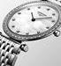Vành đồng hồ đính 44 viên kim cương Top Wesselton IF-VVS diamonds, tổng số 0.369 carats. Mặt số khảm xà cừ đính 12 viên Kim cương Top Wesselton VS-SI diamonds, tổng số 0.034 carats.
