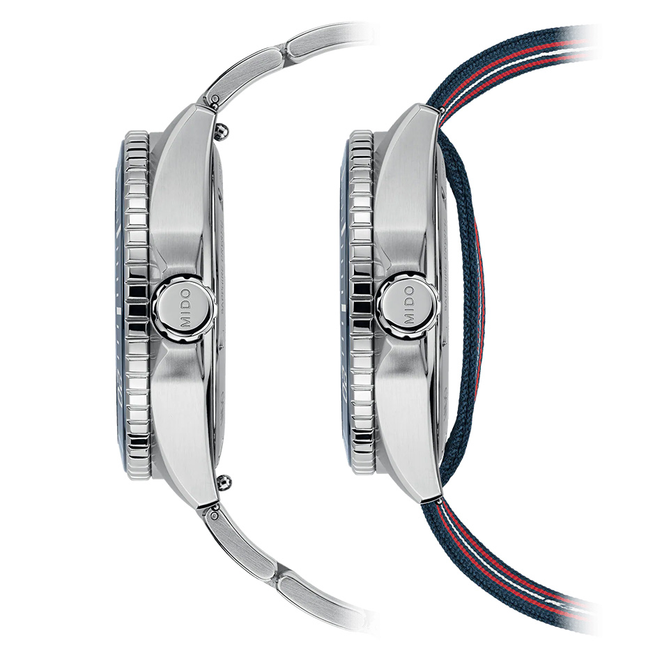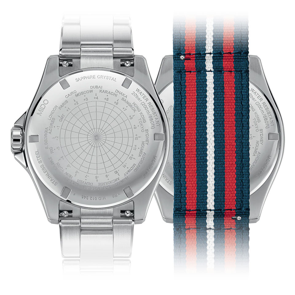 Phiên bản đặc biệt Mido Ocean Star GMT. Mỗi đồng hồ kèm theo 02 bộ dây đeo (một bộ dây thép không gỉ & một bộ dây Nylon). Chốt dây được thiết kế tháo lắp dễ dàng, người sử dụng có thể tự thay đổi dây đeo để phù hợp với trang phục và sở thích khi cần.