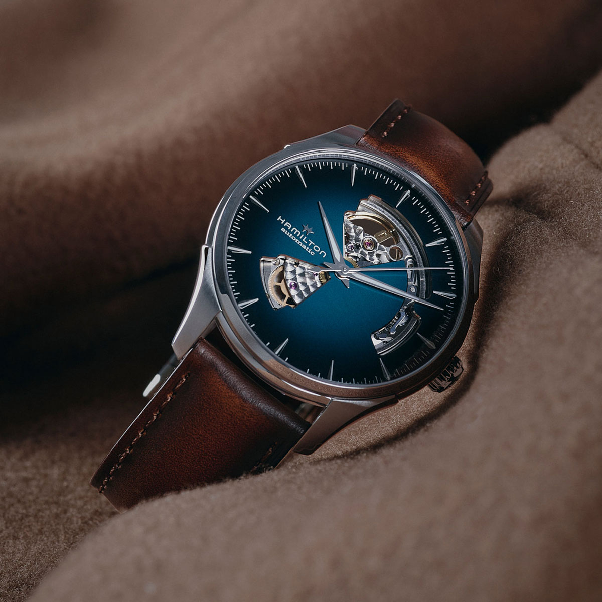 Hamilton Jazzmaster Open Heart với mặt số màu xanh quyến rũ lấp lánh, chiếc đồng hồ nổi bật này kết hợp sự hiện đại của kiến ​​trúc đô thị với sự vô tận của vũ trụ. Thể hiện sự khéo léo không ngừng phát triển của Hamilton và sự chú ý đến từng chi tiết, mặt số đưa bộ máy tự động H-10 vào tâm điểm chú ý với khả năng dự trữ năng lượng 80 giờ.