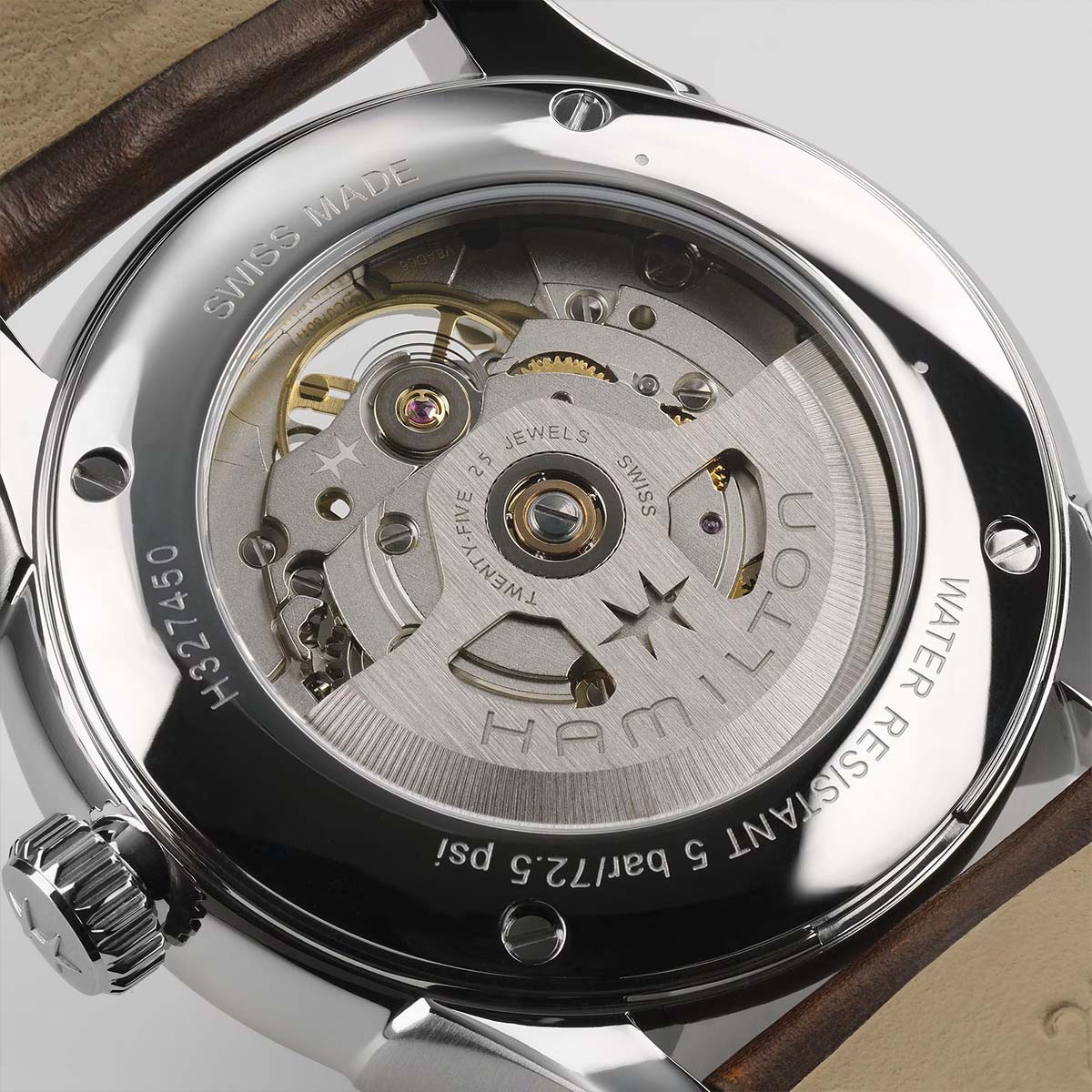 Hamilton Jazzmaster Open Heart 40mm với mặt số cắt màu đỏ tía khói, để lộ vẻ đẹp tinh tế của bộ máy bên trong chiếc đồng hồ này. Đưa bộ máy tự động H-10-S vào tâm điểm, với khả năng dự trữ năng lượng 80 giờ và lò xo cân bằng Nivachron™, Jazzmaster Open Heart được kết hợp với dây đeo bằng da màu nâu khói phù hợp, thể hiện sự khéo léo không ngừng phát triển và sự chú ý đến từng chi tiết của Hamilton.