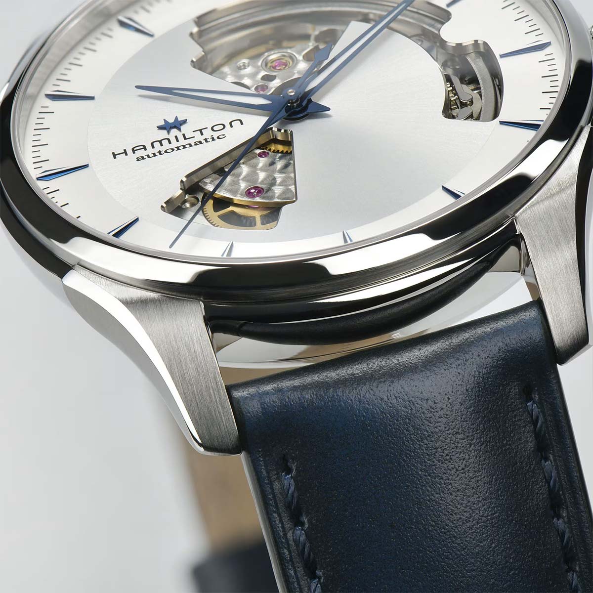 Thiết kế đồng hồ cổ điển kết hợp với phong cách đương đại trong chiếc Jazzmaster Open Heart Automatic màu xanh và bạc này. Những đường cắt tinh xảo trên mặt số 40mm hé lộ bộ máy Thụy Sĩ bên trong, mang đến cho chiếc đồng hồ tinh xảo này một cá tính mạnh mẽ riêng biệt.
