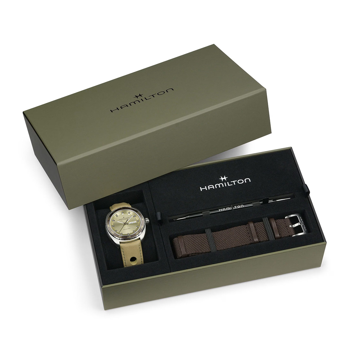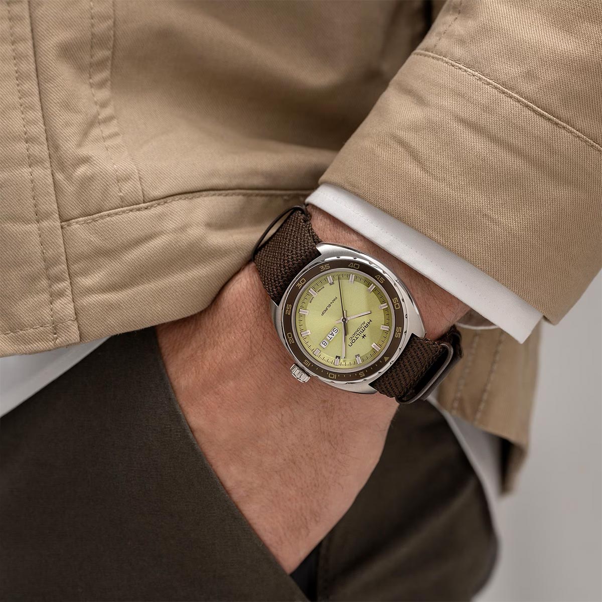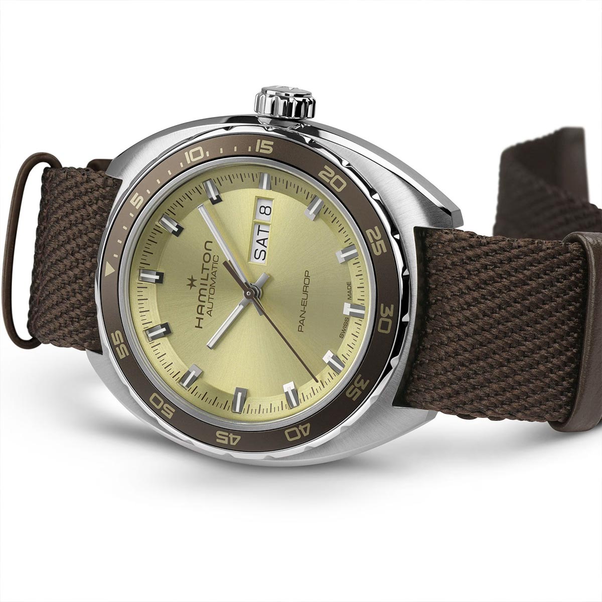 Quay ngược thời gian với chiếc Pan Europ Automatic 42mm này, sở hữu thiết kế lấy cảm hứng từ phong cách cổ điển những năm 1960. Mang hơi thở cổ điển, phù hợp với lối sống hiện đại, chiếc đồng hồ sở hữu vỏ thép không gỉ hình gối với vành bezel xoay một chiều. Là người bạn đồng hành đáng tin cậy giúp bạn chiến thắng trong cuộc đua với thời gian, Pan Europ Automatic được trang bị bộ máy tự động H-30 với khả năng dự trữ năng lượng lên đến 80 giờ. Hai lựa chọn dây đeo có thể thay đổi hoàn thiện vẻ ngoài: dây đeo vải NATO màu nâu sô cô la và dây đeo da đục lỗ mềm mại màu xanh lá cây, nhấn mạnh cảm giác đua xe của những năm 1960.