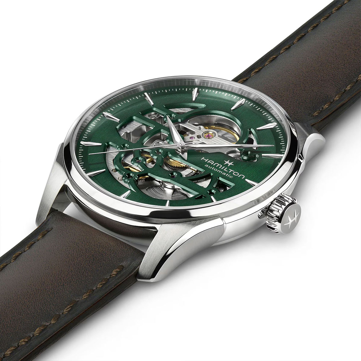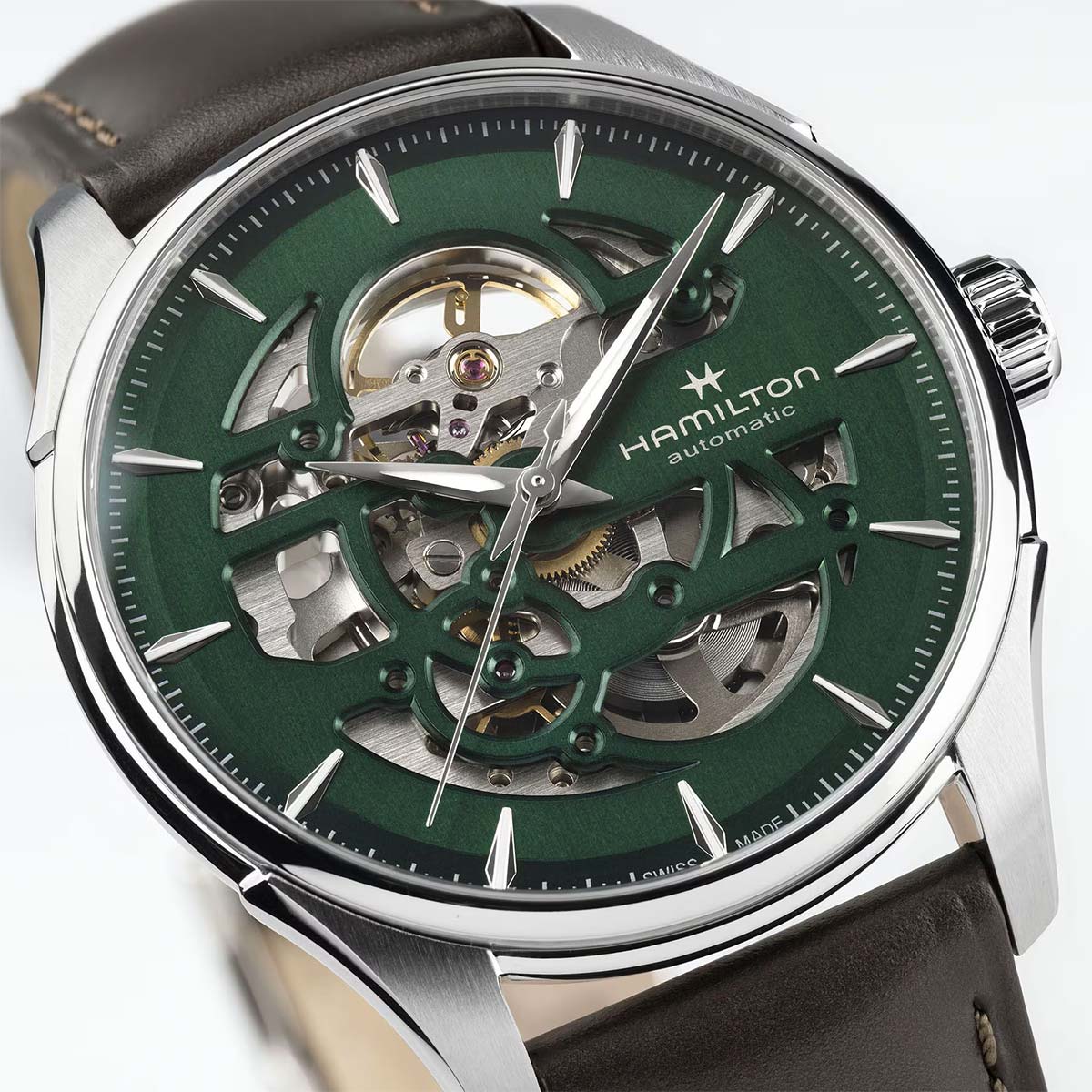 Kết hợp nhuần nhuyễn giữa truyền thống và đổi mới, Jazzmaster Skeleton 40mm hé lộ bộ máy tự động Thụy Sĩ đang vận hành. Với sắc xanh Empire nổi bật, mặt số lộ cơ cho thấy bộ máy tự động H-10-S, sở hữu 25 chân kính và mức dự trữ năng lượng ấn tượng lên đến 80 giờ. Chiếc đồng hồ biểu tượng này được kết hợp với dây đeo bằng da trơn, toát lên vẻ năng động hiện đại và vẻ đẹp vượt thời gian.