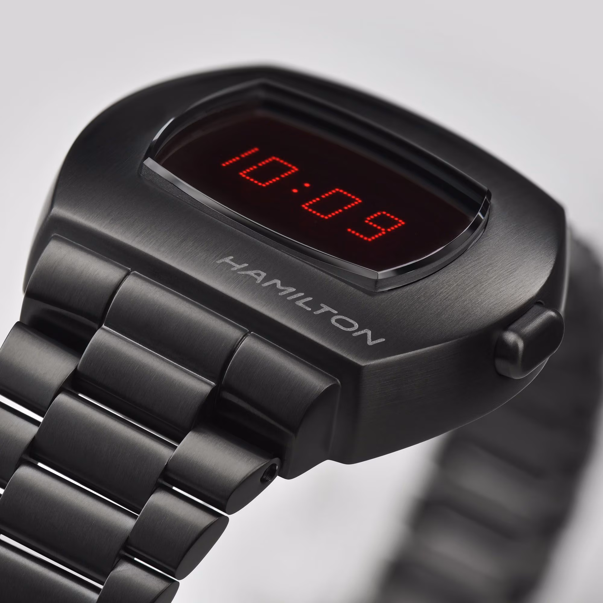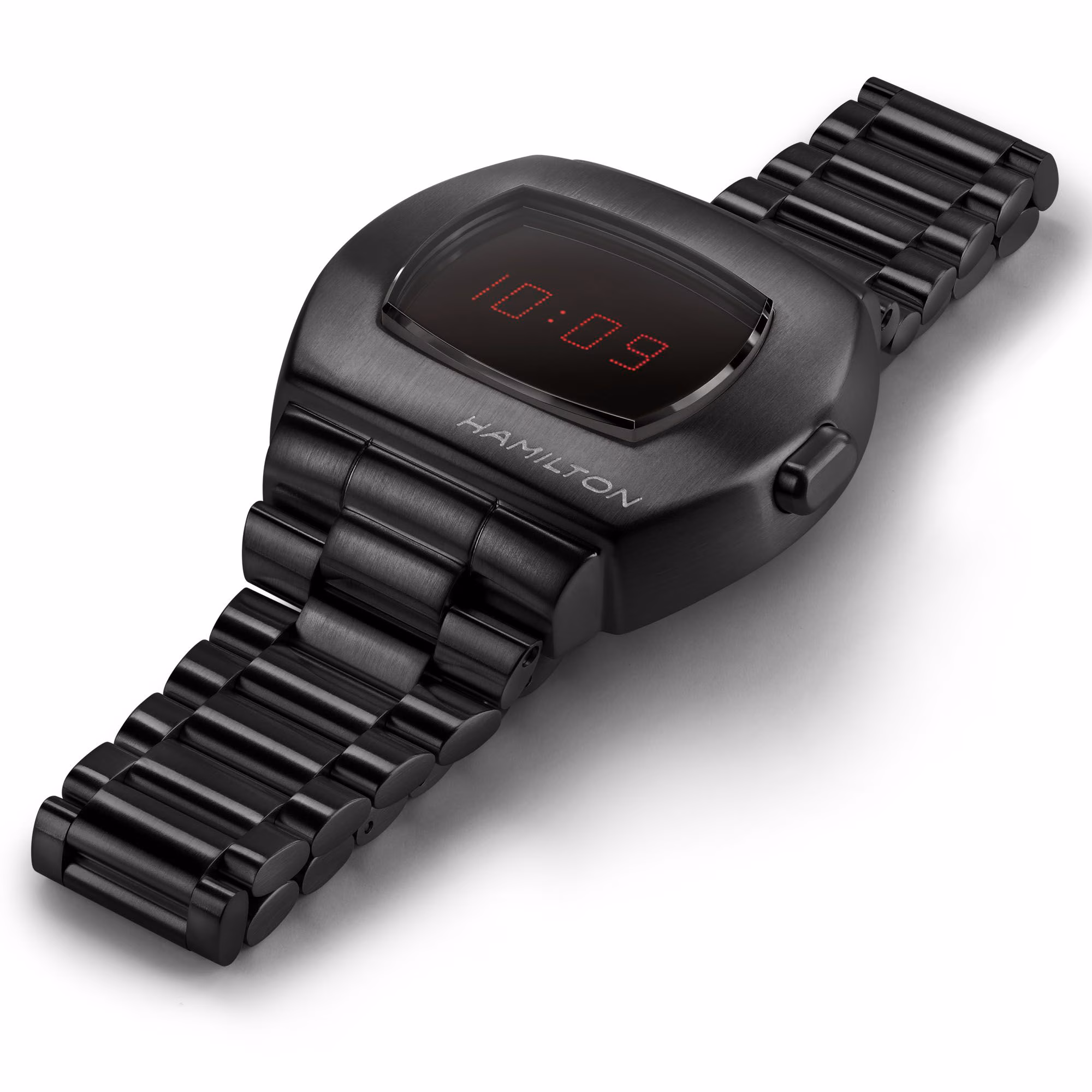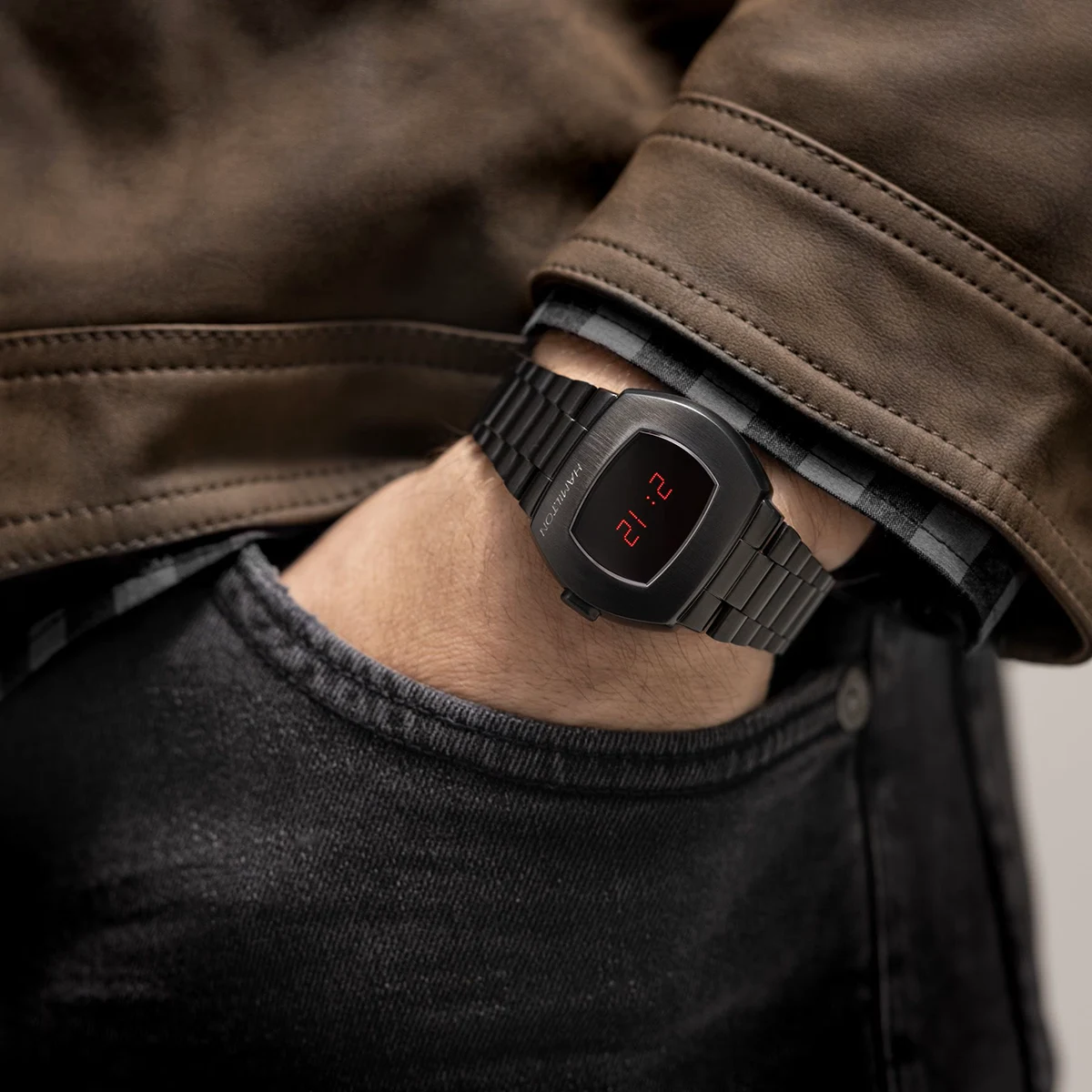 Câu chuyện đổi mới đồng hành cùng sự ra mắt của chiếc đồng hồ kỹ thuật số đầu tiên trên thế giới vào năm 1970 tiếp tục với mẫu đồng hồ Hamilton PSR Digital Quartz đen tuyền thanh lịch này. Với màn hình kỹ thuật số lai LCD và OLED, các chữ số màu đỏ có thể được đọc chỉ bằng một cái liếc mắt vào ban ngày và chỉ cần nhấn nút vào ban đêm.