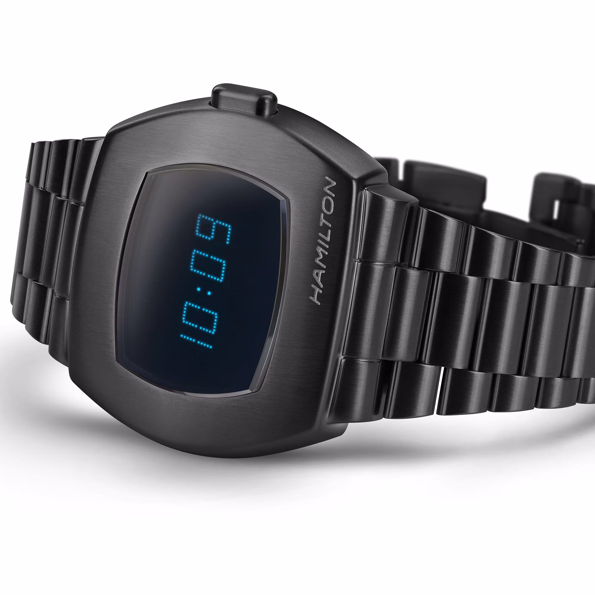 Câu chuyện đổi mới, đồng nghĩa với sự ra mắt của chiếc đồng hồ kỹ thuật số đầu tiên trên thế giới vào năm 1970, tiếp tục với mẫu đồng hồ thạch anh Hamilton PSR Digital màu đen bóng bẩy này. Với màn hình kỹ thuật số lai LCD và OLED, các chữ số màu xanh lam nổi bật của đồng hồ có thể được đọc chỉ bằng một cái liếc mắt vào ban ngày và chỉ cần một nút bấm vào ban đêm.