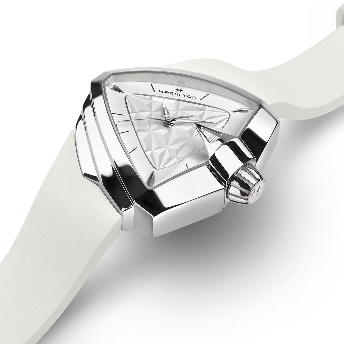 Hơn nửa thế kỷ sau, chiếc đồng hồ điện tử đầu tiên trên thế giới vẫn giữ được vẻ đẹp tương lai với vỏ hình tam giác đặc trưng. Nhắc nhở chúng ta rằng tương lai luôn tràn ngập những điều ta không thể thấy, Ventura S Quartz sở hữu thiết kế ảo ảnh 3D trên mặt số đen hoặc trắng, kết hợp cùng dây đeo cao su đồng bộ.