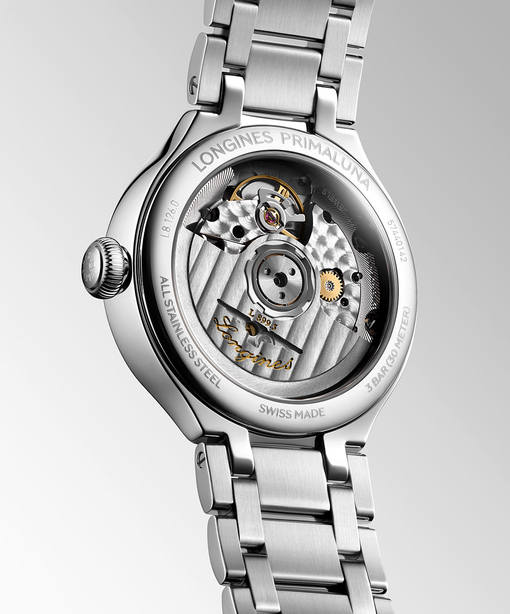 Bộ máy Longines Caliber L899 chuyển động cơ học tự động lên dây cót tốc độ 25'200 rung động mỗi giờ, với lò xo cân bằng silicon đơn tinh thể dự trữ năng lượng lên đến 72 giờ. Vành đồng hồ đính 58 viên kim cương Wesselton IF-VVS diamonds, tổng số 0.580 carats.