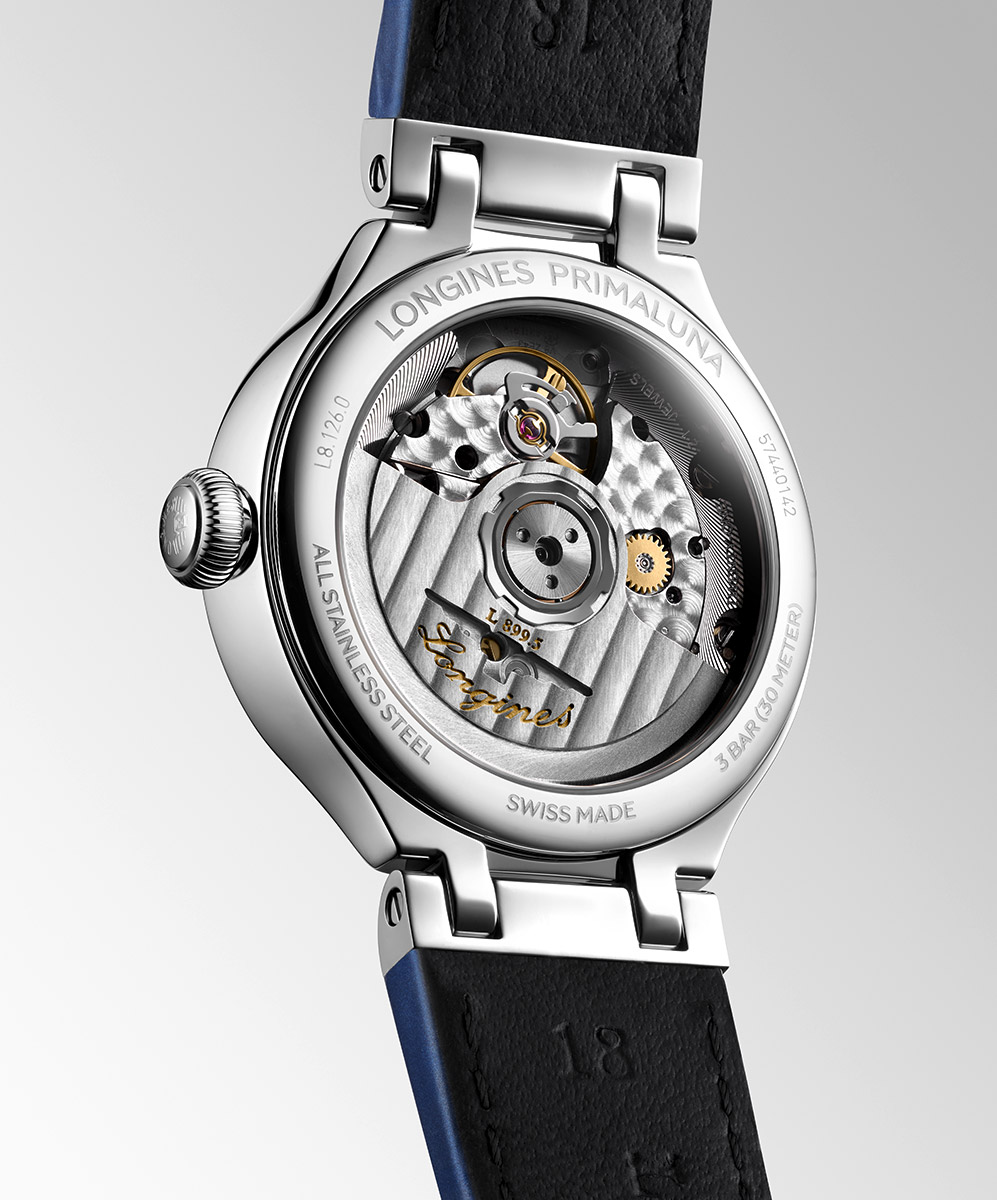 Bộ máy Longines Caliber L899 chuyển động cơ học tự động lên dây cót tốc độ 25'200 rung động mỗi giờ, với lò xo cân bằng silicon đơn tinh thể dự trữ năng lượng lên đến 72 giờ. Mặt số khảm xà cừ màu xanh cọc số đính 14 viên kim cương Top Wesselton VS-SI diamonds, tổng số 0.060 carats.