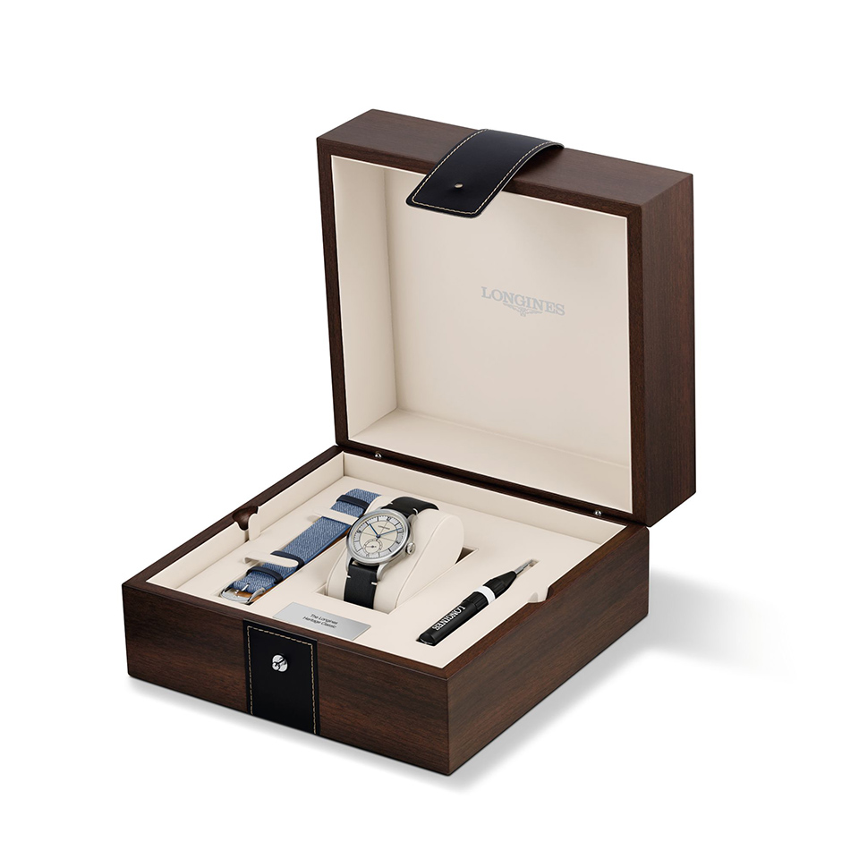 Phiên bản đặc biệt ""Longines Heritage Classic Sector Dial Automatic" kèm theo 02 bộ dây đeo cùng hộp đựng đặc biệt. Chốt dây được thiết kế tháo lắp dễ dàng, người đeo tự thay thế và đổi dây đeo theo sở thích khi cần.
