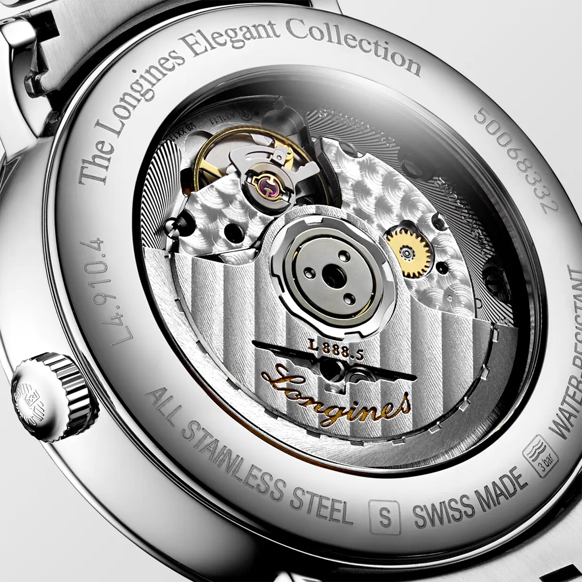 Bộ máy Longines Caliber L888 chuyển động cơ học tự động lên dây cót tốc độ 25'200 rung động mỗi giờ, với lò xo cân bằng silicon đơn tinh thể dự trữ năng lượng lên đến 72 giờ. Mặt số đính 13 viên kim cương Top Wesselton VS-SI diamonds, tổng số 0.032 carats.