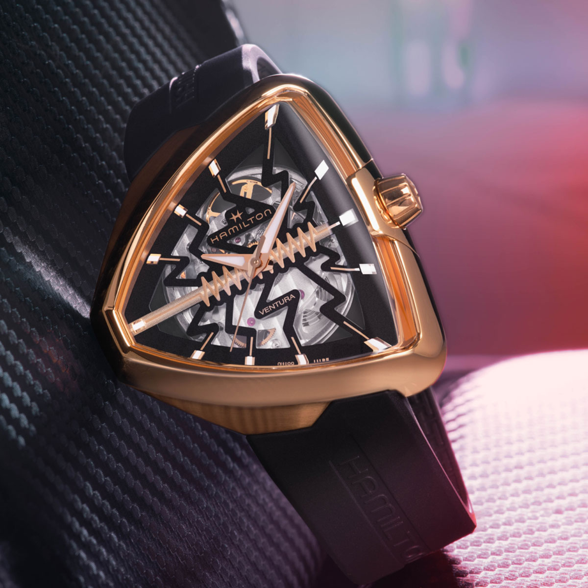 Hãy mạnh dạn thể hiện bản thân với Hamilton Ventura Elvis80 Skeleton, một sự tôn vinh siêu hiện đại cho quá khứ, hiện tại và tương lai của chiếc đồng hồ điện đầu tiên trên thế giới. Một sự tiến hóa mạnh mẽ của một chiếc đồng hồ mang tính cách mạng, mặt số lộ cơ chính xác của nó có đường zíc zắc nổi bật ở trung tâm để phù hợp với vỏ hình tam giác phủ PVD vàng hồng sáng bóng. Tia năng lượng này tôn vinh một biểu tượng mang tính biểu tượng của sự đổi mới và thu hút sự chú ý vào bộ máy tự động H-10-S bên dưới.