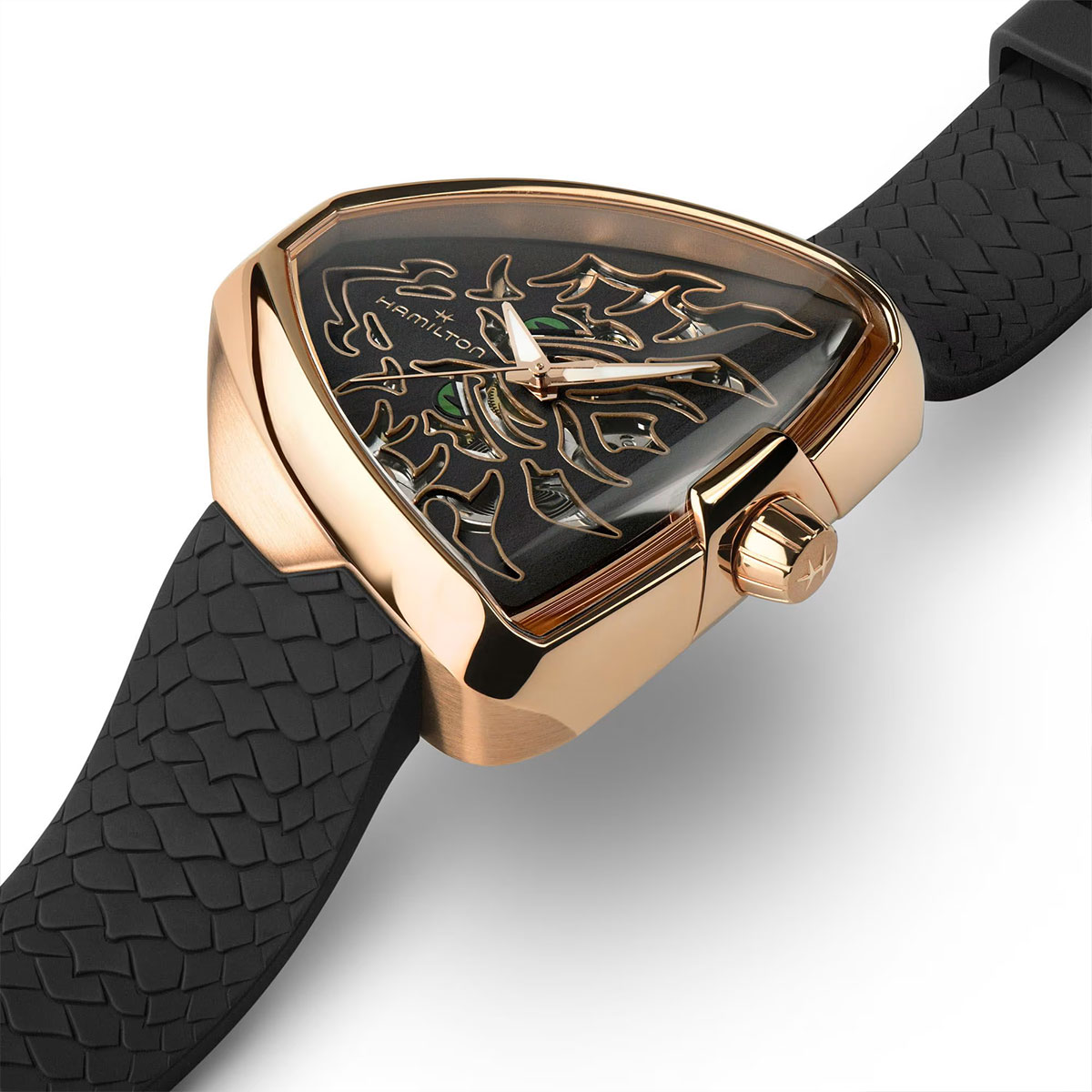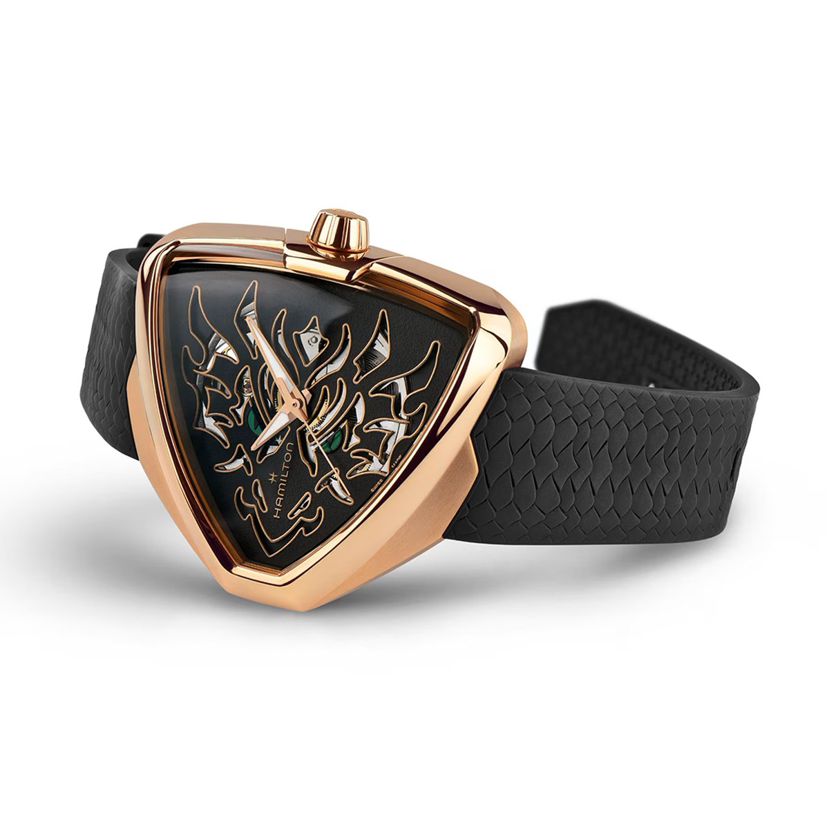 Rồng có nhiều ý nghĩa đẹp trong văn hóa phương Đông, ngoài sức mạnh và may mắn; nó còn tượng trưng cho tinh thần khởi nghiệp mạnh mẽ và thường là biểu tượng của cơ hội và thành công. Với vỏ phủ PVD vàng hồng và mặt số skeleton đen, Hamilton Ventura Elvis80 Skeleton Dragon được hoàn thiện bằng dây đeo cao su hình vảy rồng 3D. Bên dưới mặt số là bộ máy H-10-S với khả năng dự trữ năng lượng 80 giờ và lò xo cân bằng Nivachron™, ngoài ra còn có kim giờ và kim phút phủ Super-LumiNova® để dễ đọc vào ban đêm.