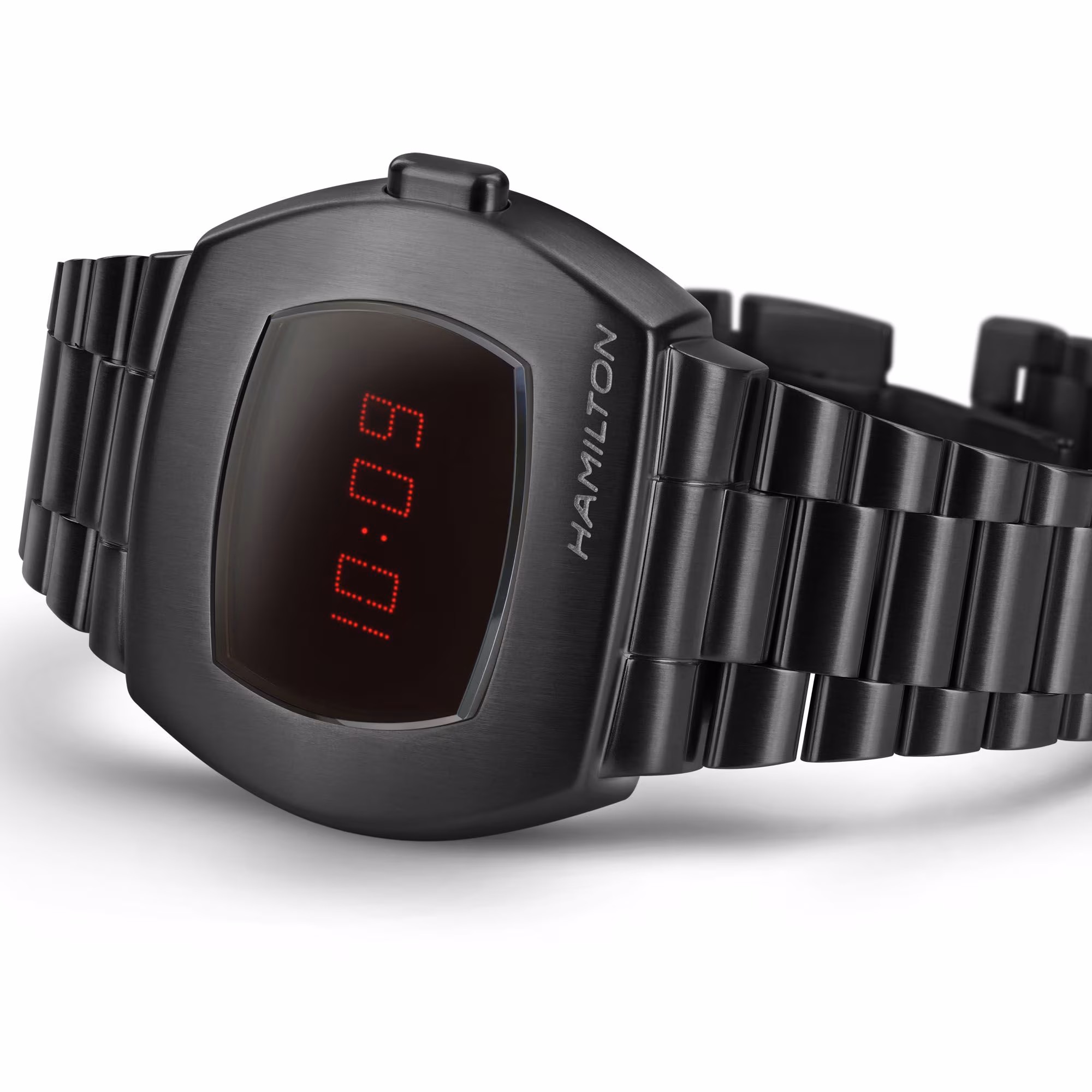 Câu chuyện đổi mới đồng hành cùng sự ra mắt của chiếc đồng hồ kỹ thuật số đầu tiên trên thế giới vào năm 1970 tiếp tục với mẫu đồng hồ Hamilton PSR Digital Quartz đen tuyền thanh lịch này. Với màn hình kỹ thuật số lai LCD và OLED, các chữ số màu đỏ có thể được đọc chỉ bằng một cái liếc mắt vào ban ngày và chỉ cần nhấn nút vào ban đêm.