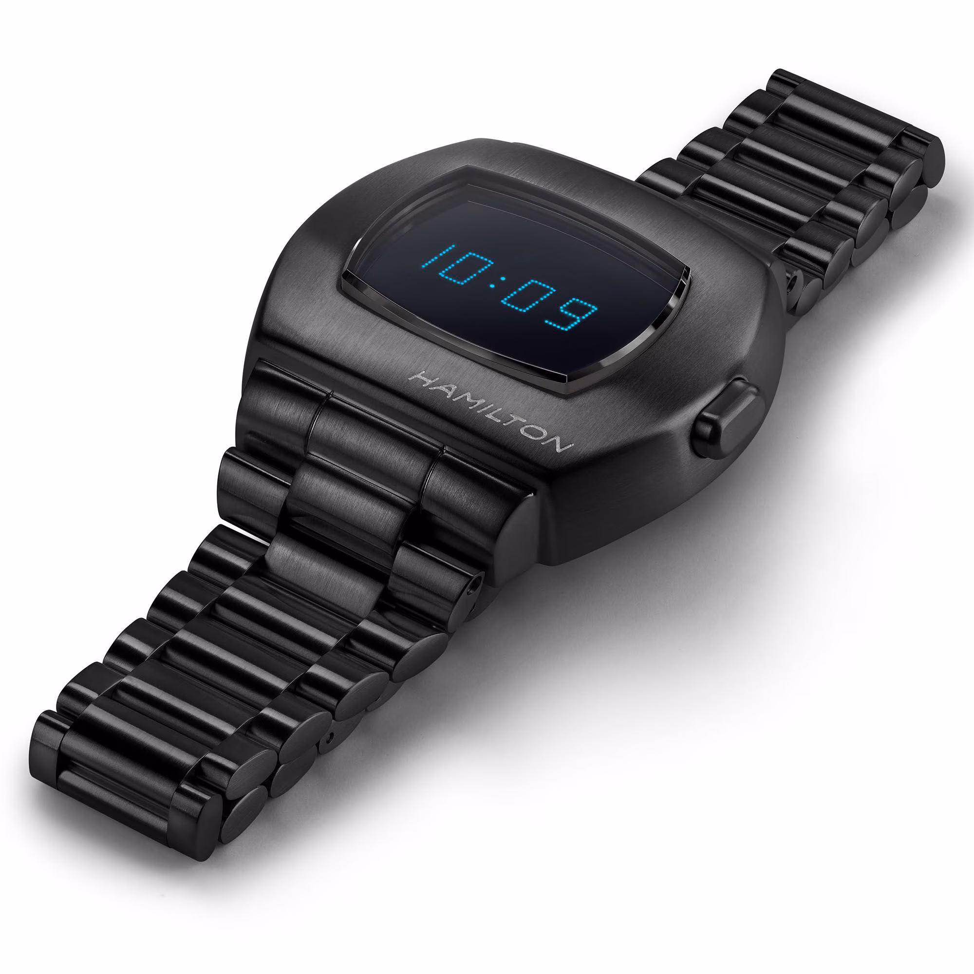 Câu chuyện đổi mới, đồng nghĩa với sự ra mắt của chiếc đồng hồ kỹ thuật số đầu tiên trên thế giới vào năm 1970, tiếp tục với mẫu đồng hồ thạch anh Hamilton PSR Digital màu đen bóng bẩy này. Với màn hình kỹ thuật số lai LCD và OLED, các chữ số màu xanh lam nổi bật của đồng hồ có thể được đọc chỉ bằng một cái liếc mắt vào ban ngày và chỉ cần một nút bấm vào ban đêm.