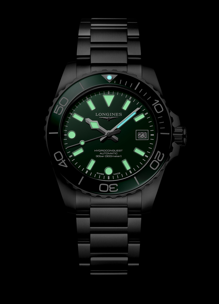 Longines HydroConquest kết hợp tính thẩm mỹ hiện đại với hiệu năng hoạt động ổn định cao. Được trang bị bộ máy tự động độc quyền của LONGINES tự động lên dây cót tích hợp khả năng kháng từ, hoạt động với tần số 25.200 dao động mỗi giờ, cùng với lò xo cân bằng bằng silicon đơn tinh thể có khả năng dự trữ năng lượng lên đến 72 giờ., khả năng chống nước lên đến 30 bar (300 m), với vòng bezel xoay một chiều, núm vặn và nắp lưng vặn chặt.