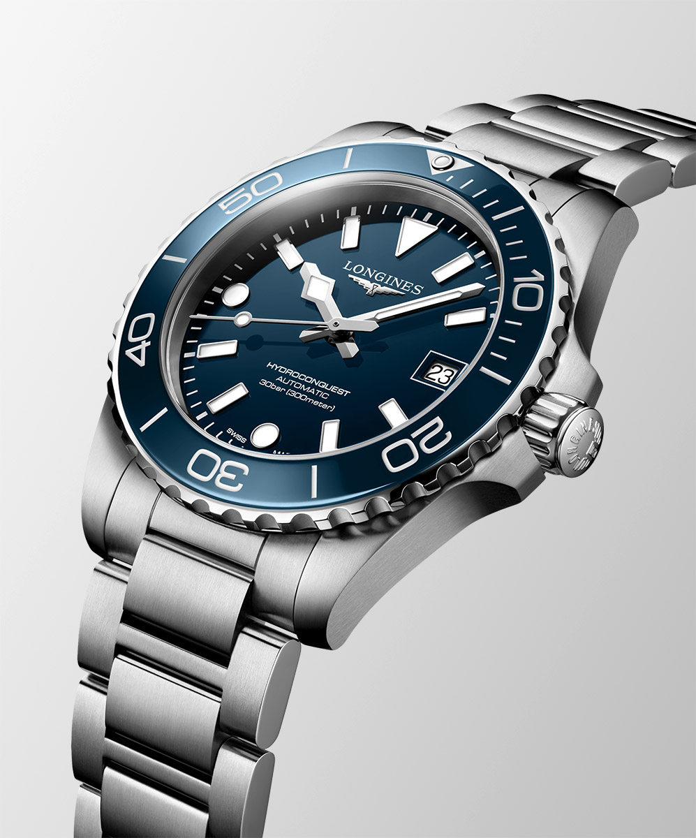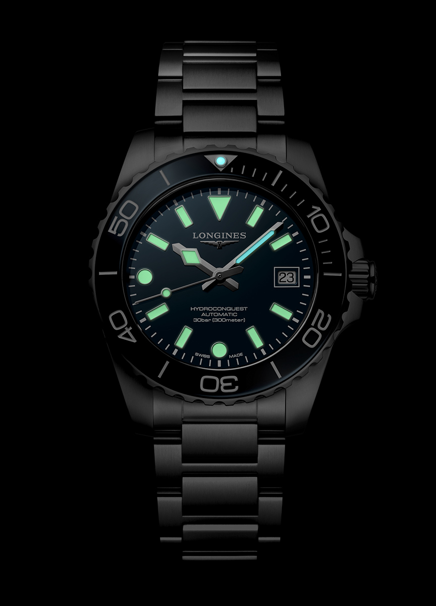 Longines HydroConquest kết hợp tính thẩm mỹ hiện đại với hiệu năng hoạt động ổn định cao. Được trang bị bộ máy tự động độc quyền của LONGINES tự động lên dây cót tích hợp khả năng kháng từ, hoạt động với tần số 25.200 dao động mỗi giờ, cùng với lò xo cân bằng bằng silicon đơn tinh thể có khả năng dự trữ năng lượng lên đến 72 giờ., khả năng chống nước lên đến 30 bar (300 m), với vòng bezel xoay một chiều, núm vặn và nắp lưng vặn chặt.