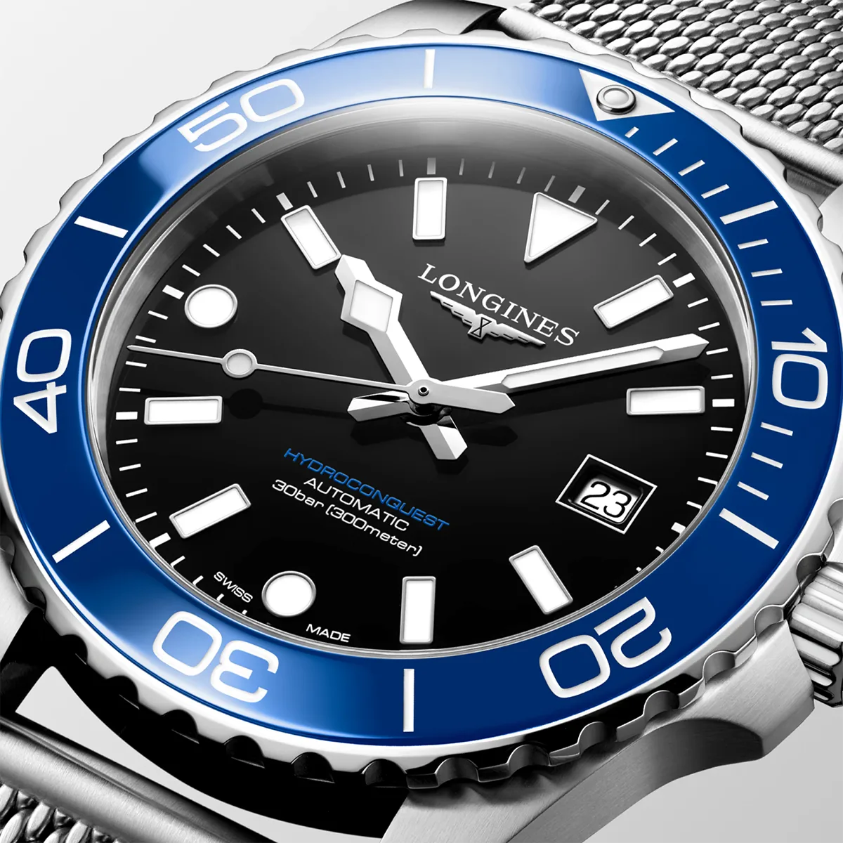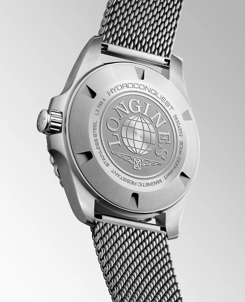 Longines HydroConquest kết hợp tính thẩm mỹ hiện đại với hiệu năng hoạt động ổn định cao. Được trang bị bộ máy tự động độc quyền của LONGINES tự động lên dây cót tích hợp khả năng kháng từ, hoạt động với tần số 25.200 dao động mỗi giờ, cùng với lò xo cân bằng bằng silicon đơn tinh thể có khả năng dự trữ năng lượng lên đến 72 giờ., khả năng chống nước lên đến 30 bar (300 m), với vòng bezel xoay một chiều, núm vặn và nắp lưng vặn chặt.