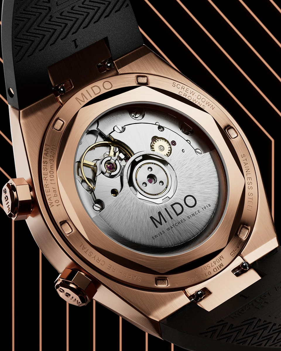 Trên mặt số màu đen mờ được gia công tinh tế, các họa tiết nằm ngang chạm nổi tuyệt đẹp tạo nên hiệu ứng ánh sáng rực rỡ. Các vạch chỉ giờ "lõm" - tròn và hình thang tại các vị trí 3, 6, 9 và 12 giờ - tạo nên hiệu ứng 3D bắt mắt. Các vạch chỉ giờ, kim giờ và phút màu trắng được phủ lớp dạ quang Super-LumiNova® nhằm đảm bảo khả năng đọc trong mọi hoàn cảnh. Viền trong mặt bích xoay có các vạch chỉ phút góp phần hoàn thiện ngoại diện độc đáo của chế tác. Được vận hành bằng núm điều chỉnh ở vị trí 2 giờ, mặt bích hiệu chỉnh này có thể được sử dụng để đếm ngược thời gian. Chức năng độc đáo này được lấy cảm hứng từ dòng đồng hồ lặn đang dần phổ biến lại thị trường của Mido.