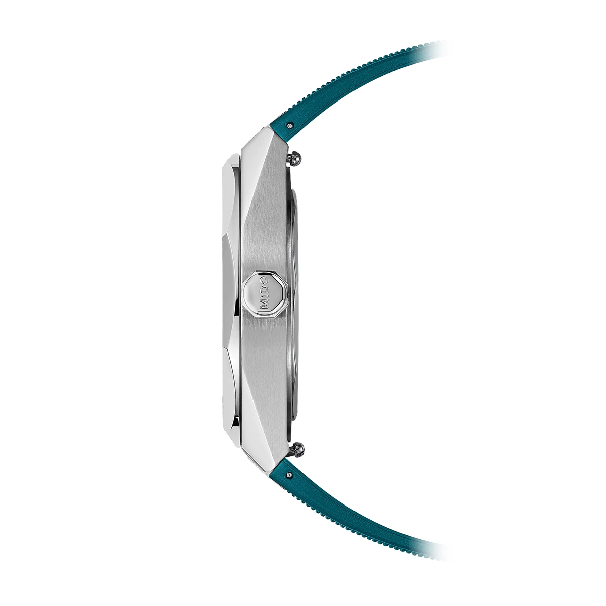 Với những đường nét tinh tế, vỏ đồng hồ 40 mm cân đối và vành bezel hình bát giác độc đáo, Multifort 8 One Crown thể hiện thiết kế táo bạo và hiện đại. Mặt số được cấu trúc bằng các rãnh ngang, tạo nên nhịp điệu và chiều sâu, trong khi chất phát quang Super-LumiNova® đảm bảo khả năng đọc giờ hoàn hảo. Mặt kính sapphire chống phản chiếu hai mặt bảo vệ mặt số, được tăng cường bởi vỏ thép hoàn thiện mờ với các cạnh được đánh bóng. Được trang bị bộ máy Caliber 80 – một bộ máy tự động Thụy Sĩ với khả năng dự trữ năng lượng kéo dài, có thể nhìn thấy qua mặt sau trong suốt – chiếc đồng hồ này phản ánh tầm nhìn TECHNOMETRY của MIDO: sự kết hợp hài hòa giữa công nghệ và hình học. Mạnh mẽ, chính xác và phong cách, Multifort 8 One Crown được tạo ra dành cho những người đòi hỏi sự xuất sắc với cá tính riêng.