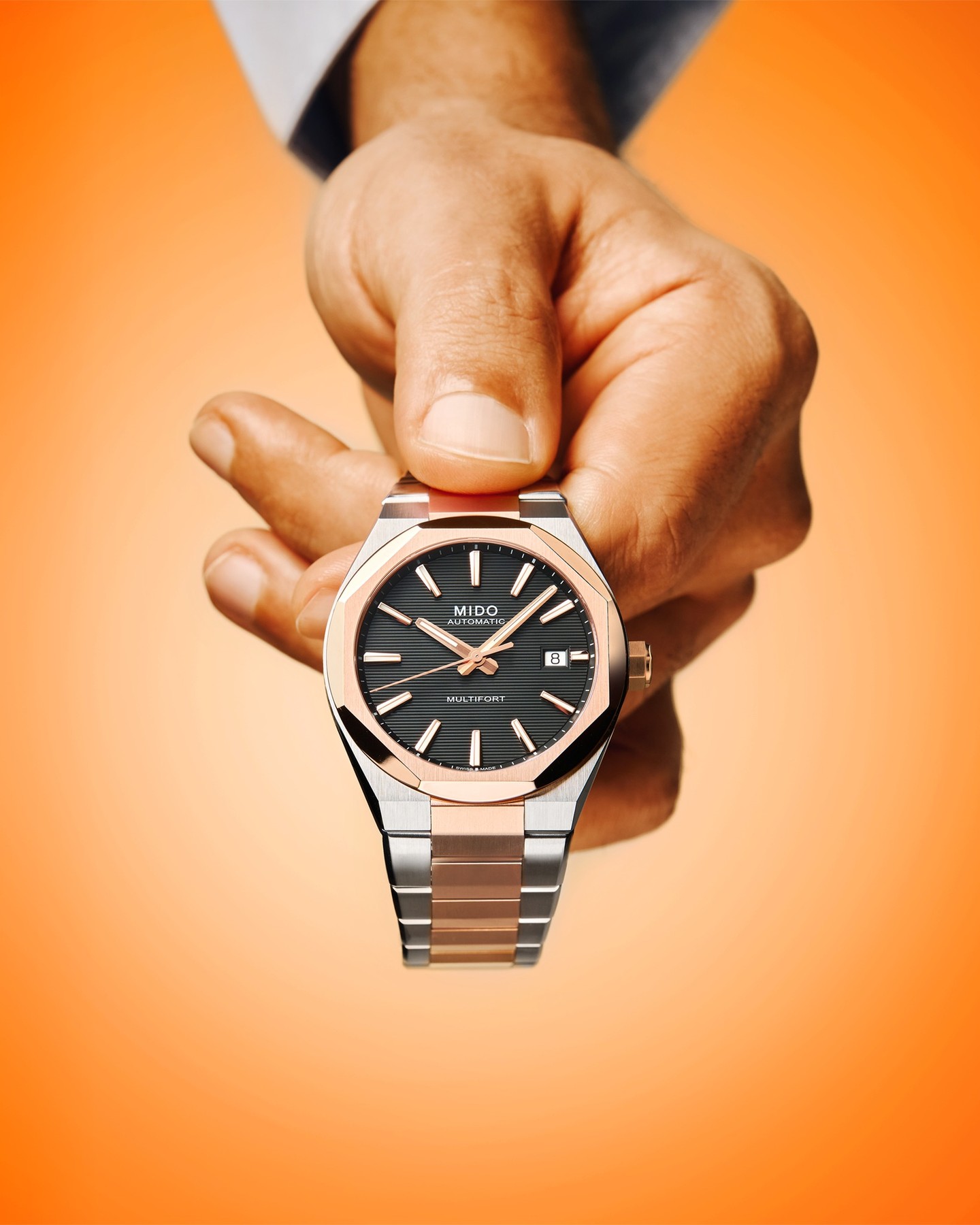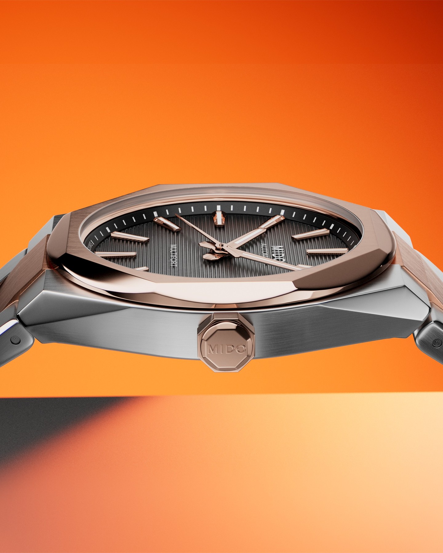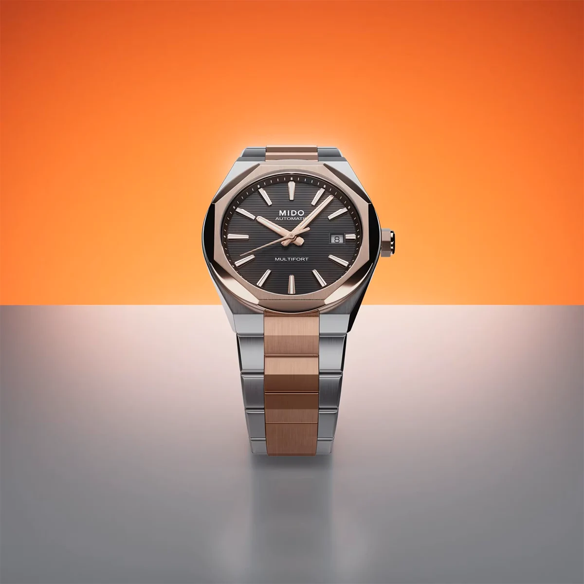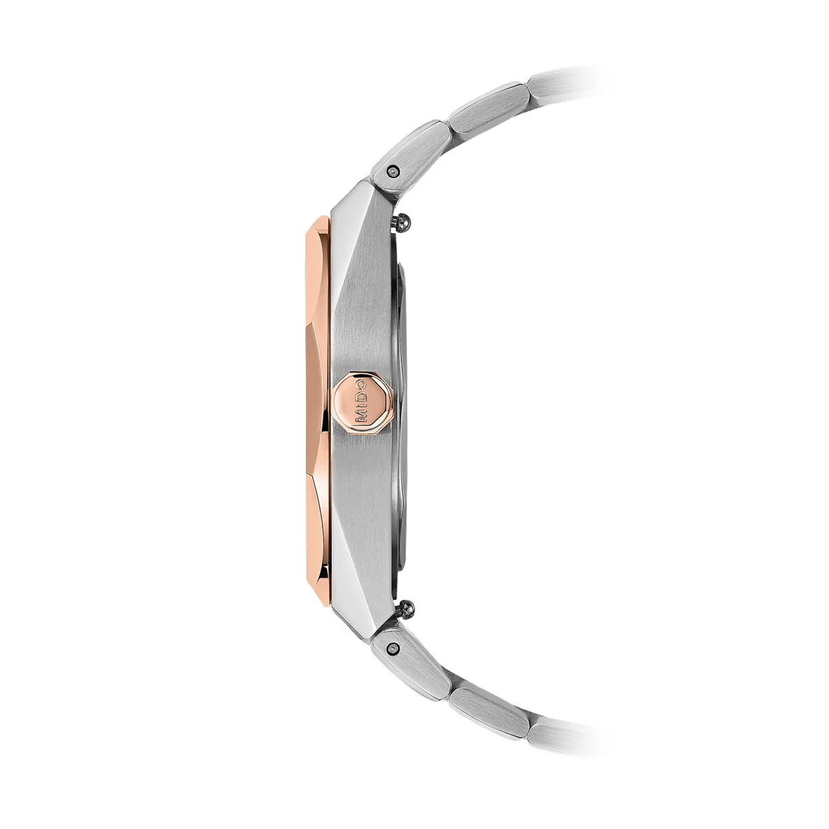 Với những đường nét tinh tế, vỏ đồng hồ 40mm cân đối và vành bezel hình bát giác độc đáo, Multifort 8 One Crown thể hiện thiết kế táo bạo và hiện đại. Mặt số được cấu trúc bằng các rãnh ngang, tạo nên nhịp điệu và chiều sâu, trong khi chất phát quang Super-LumiNova® đảm bảo khả năng đọc giờ hoàn hảo. Mặt kính sapphire chống phản chiếu hai mặt bảo vệ mặt số, được tăng cường bởi vỏ thép hoàn thiện mờ với các cạnh được đánh bóng. Được trang bị bộ máy Caliber 80 - một bộ máy tự động Thụy Sĩ với khả năng dự trữ năng lượng kéo dài, có thể nhìn thấy bộ máy qua mặt sau trong suốt - chiếc đồng hồ này phản ánh tầm nhìn TECHNOMETRY của MIDO: sự kết hợp hài hòa giữa công nghệ và hình học. Mạnh mẽ, chính xác và phong cách, Multifort 8 One Crown được tạo ra dành cho những người đòi hỏi sự xuất sắc với cá tính riêng.