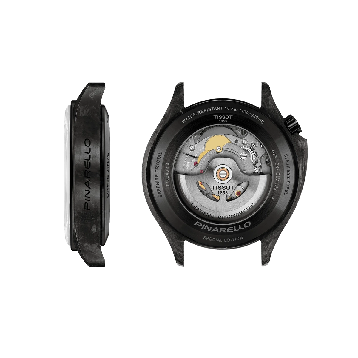 Lần đầu tiên, Tissot và Pinarello kết hợp hai thế giới của mình, kết hợp hơn 170 năm kinh nghiệm chế tác đồng hồ Thụy Sĩ với di sản Ý của nhà sản xuất xe đạp hiệu suất cao nổi tiếng. Được dẫn dắt bởi niềm đam mê chung dành cho việc đạp xe và sáng tạo có mục đích, phiên bản đặc biệt Tissot Pinarello phản ánh những giá trị mà cả hai thương hiệu đều theo đuổi: độ chính xác, kỹ thuật chế tác và sự không ngừng theo đuổi sự tiến bộ. Vỏ carbon rèn 42mm ngay lập tức thể hiện DNA đua xe của Pinarello, sử dụng cùng loại vật liệu nhẹ và siêu bền được tìm thấy trong khung xe hiệu suất cao của thương hiệu. Hình dáng bất đối xứng của nó—với núm vặn đặt ở vị trí 10 giờ, chiều rộng từ 3 đến 9 giờ là 43 mm và chiều dài từ 6 đến 12 giờ là 40 mm—lấy cảm hứng trực tiếp từ thiết kế đặc trưng của phuộc Pinarello, mang đến cho chiếc đồng hồ một bản sắc riêng biệt. Các vạch chỉ giờ mạ niken đen được phủ Super-LumiNova® đảm bảo khả năng đọc giờ tối ưu và mang lại vẻ đẹp kỹ thuật tinh tế. Kim giờ và kim phút được mài rãnh tinh tế bắt sáng với những chuyển động nhẹ nhàng, trong khi kim giây – có hình dạng chữ “P” của Pinarello và được hoàn thiện bằng màu Borealis, một màu sắc đặc trưng gắn liền với bản sắc thương hiệu – tạo thêm điểm nhấn màu sắc và chuyển động độc đáo. Trái tim của chiếc đồng hồ là bộ máy Powermatic 80 đạt chứng nhận COSC đảm bảo độ chính xác bền bỉ theo thời gian và địa hình. Lò xo cân bằng Nivachron™ bảo vệ bộ máy khỏi từ trường và sự thay đổi nhiệt độ, tăng cường độ tin cậy khi đeo hàng ngày, cùng với khả năng chống nước 10 bar giúp tăng thêm độ bền. Phiên bản đặc biệt Tissot Pinarello được đựng trong hộp sưu tập độc quyền. Bên trong, hệ thống dây đeo có thể thay đổi mang đến sự linh hoạt từ yên xe đến thành phố: một dây đeo kỹ thuật hiệu suất cao cho những khoảnh khắc năng động, và một dây đeo da Ý thủ công bổ sung mang đến nét tinh tế cho việc đeo hàng ngày. Việc chuyển đổi giữa chúng chỉ cần một thao tác đơn giản, dễ dàng thích ứng với nhịp độ của người đeo.