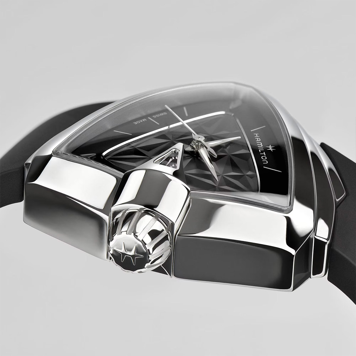 Hơn nửa thế kỷ sau, chiếc đồng hồ điện tử đầu tiên trên thế giới vẫn giữ được vẻ đẹp tương lai với vỏ hình tam giác đặc trưng. Nhắc nhở chúng ta rằng tương lai luôn tràn ngập những điều ta không thể thấy, Ventura S Quartz sở hữu thiết kế ảo ảnh 3D trên mặt số đen hoặc trắng, kết hợp cùng dây đeo cao su đồng bộ.