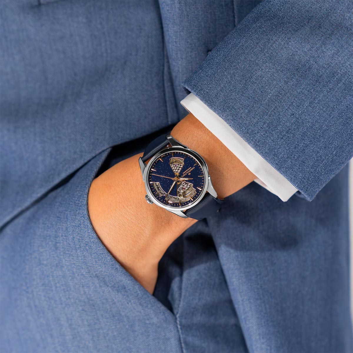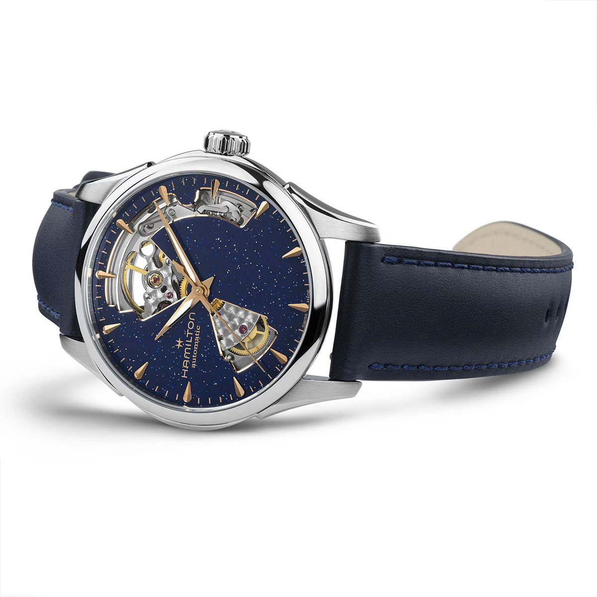 Hamilton Jazzmaster Open Heart mang đến cái nhìn thoáng qua về bộ máy bên trong. Với mặt số màu xanh nửa đêm quyến rũ lấp lánh, chiếc đồng hồ nổi bật này kết hợp sự hiện đại của kiến ​​trúc đô thị với sự vô tận của vũ trụ. Thể hiện sự khéo léo không ngừng phát triển của Hamilton và sự chú ý đến từng chi tiết, mặt số đưa bộ máy tự động H-10 vào tâm điểm chú ý. Với khả năng dự trữ năng lượng 80 giờ và lò xo cân bằng Nivachron™, Jazzmaster Open Heart Auto được trang bị dây đeo bằng thép không gỉ tinh xảo. Khám phá bộ sưu tập đồng hồ đeo tay của chúng tôi.