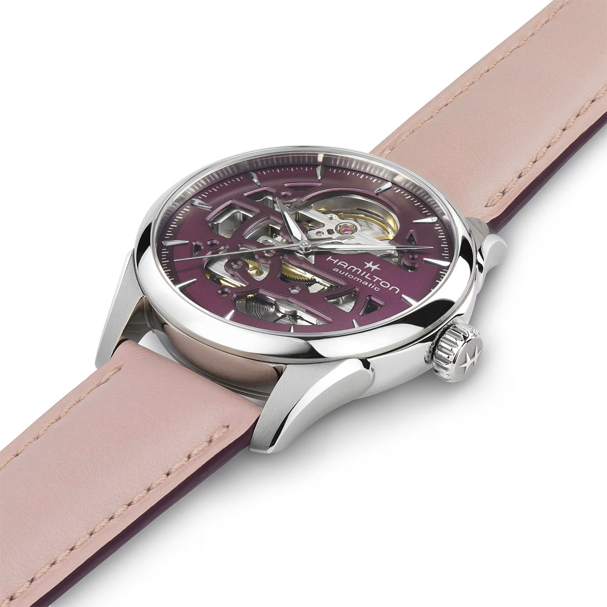 Hamilton Jazzmaster Skeleton 36mm với mặt số cắt màu tím, để lộ vẻ đẹp tinh tế của bộ máy bên trong chiếc đồng hồ này. Đưa bộ máy tự động H-10-S vào tâm điểm, với khả năng dự trữ năng lượng 80 giờ và lò xo cân bằng Nivachron™, Hamilton Jazzmaster Skeleton được trang bị dây đeo bằng da màu hồng tinh tế, thể hiện sự khéo léo không ngừng phát triển và sự chú ý đến từng chi tiết của Hamilton.