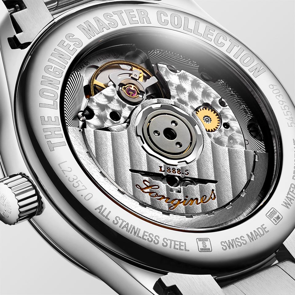 Bộ máy Longines Caliber L888 chuyển động cơ học tự động lên dây cót tốc độ 25'200 rung động mỗi giờ, với khả năng dự trữ năng lượng bằng lò xo cân bằng silicon đơn tinh thể lên đến 72 giờ.
