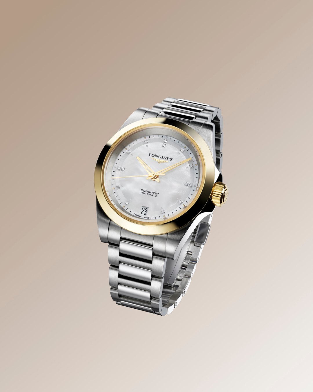 Bộ máy Longines Caliber L888 chuyển động cơ học tự động lên dây cót tốc độ 25'200 rung động mỗi giờ với lò xo cân bằng silicon đơn tinh thể, bộ máy kháng từ khả năng trữ cót lên đến 72 giờ. Mặt số khảm xà cừ & đính 14 viên kim cương Top Wesselton VS-SI diamonds, tổng số 0.035 carats.