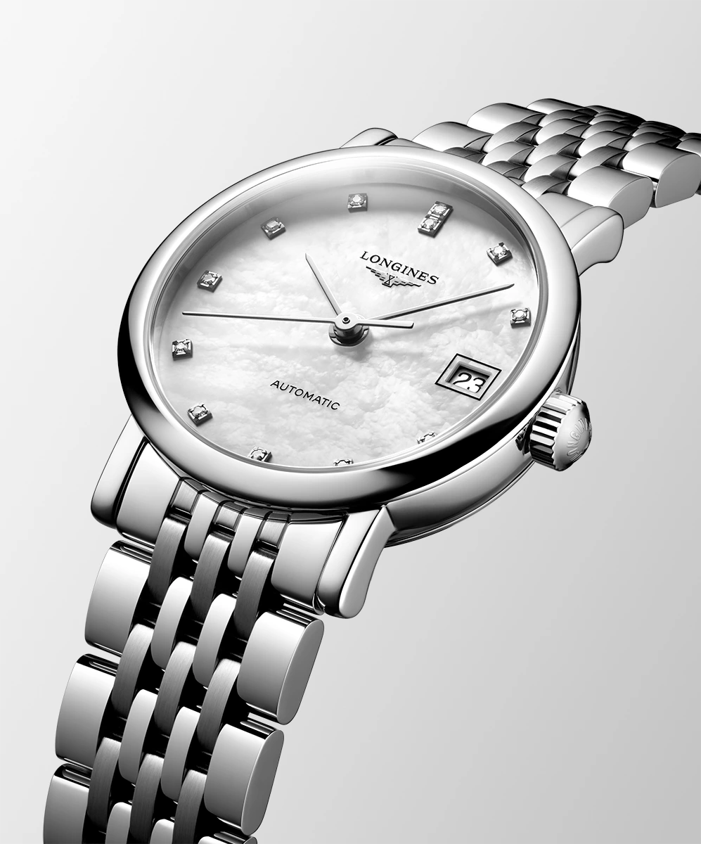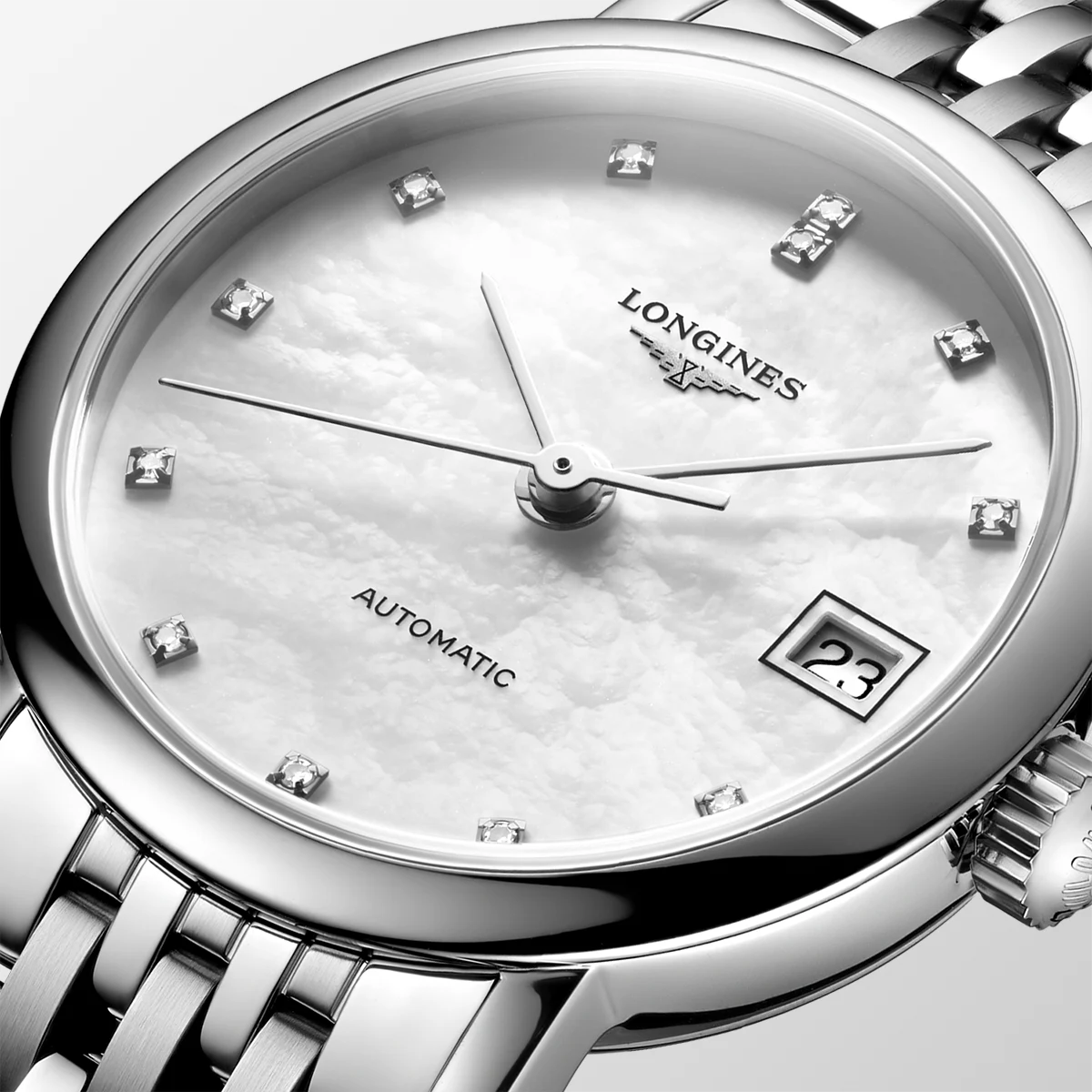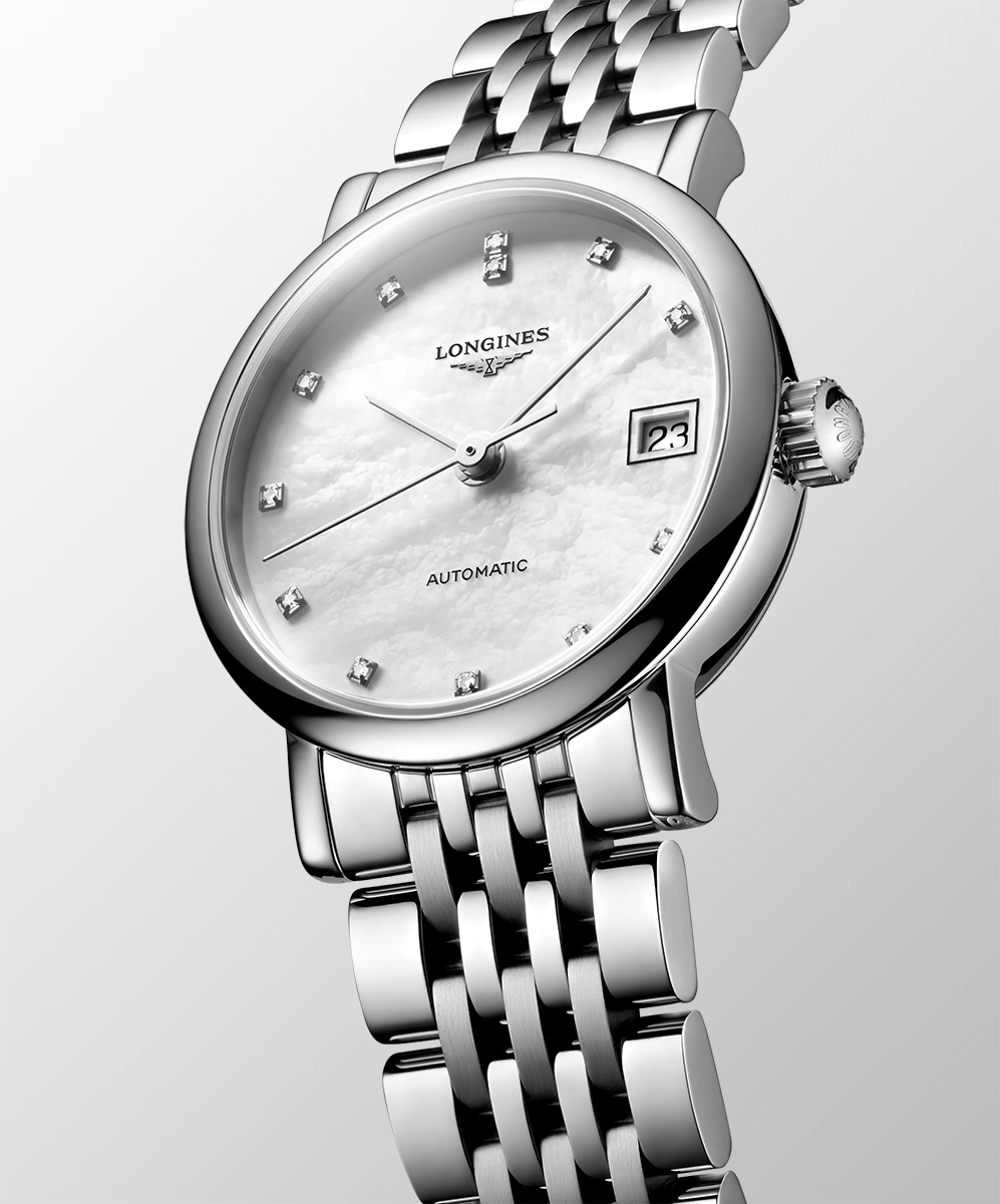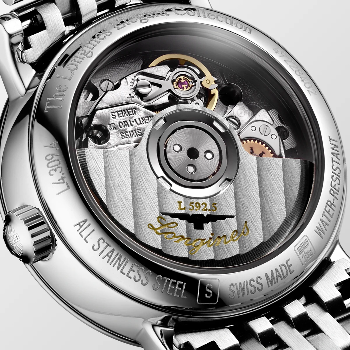 Bộ máy Longines Caliber L592 chuyển động cơ học tự động lên dây cót tốc độ 28'800 rung động mỗi giờ với lò xo cân bằng silicon đơn tinh thể, khả năng trữ cót lên đến 45 giờ. Mặt số khảm xà cừ trắng & đính 12 viên kim cương Top Wesselton VS-SI diamonds, tổng số 0.026 carats.