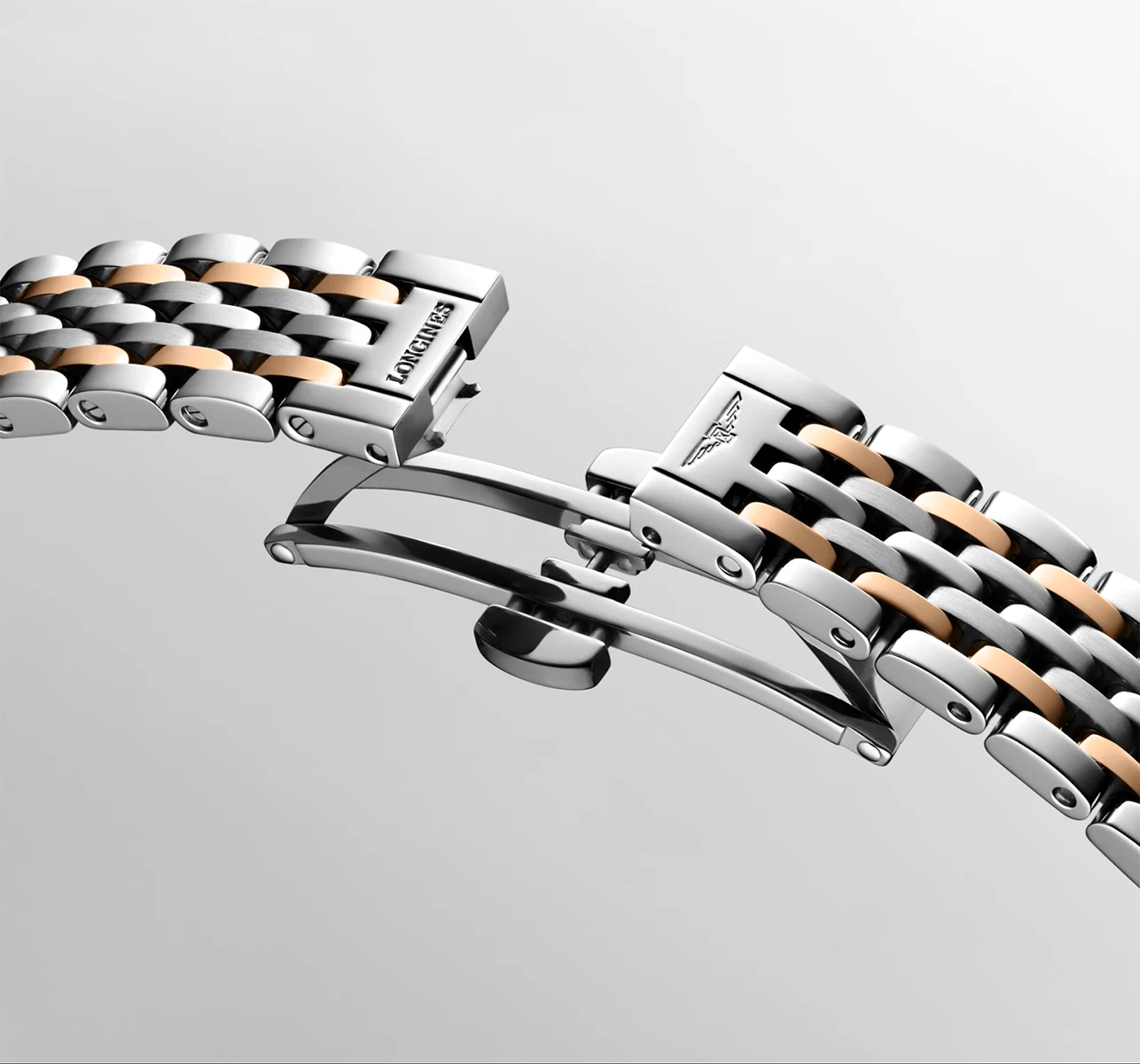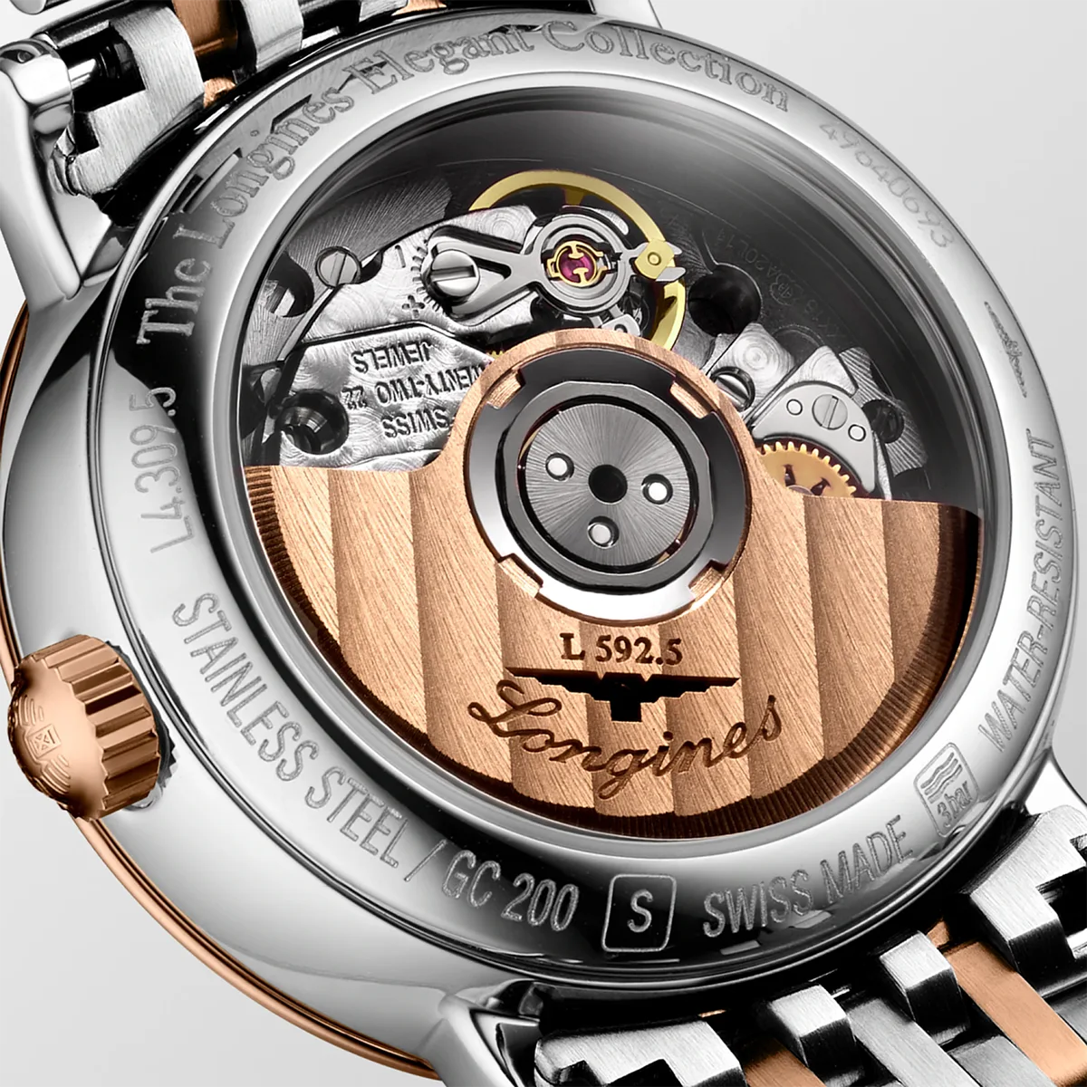 Bộ máy Longines Caliber L592 chuyển động cơ học tự động lên dây cót tốc độ 28'800 rung động mỗi giờ với lò xo cân bằng silicon đơn tinh thể, khả năng trữ cót lên đến 45 giờ.