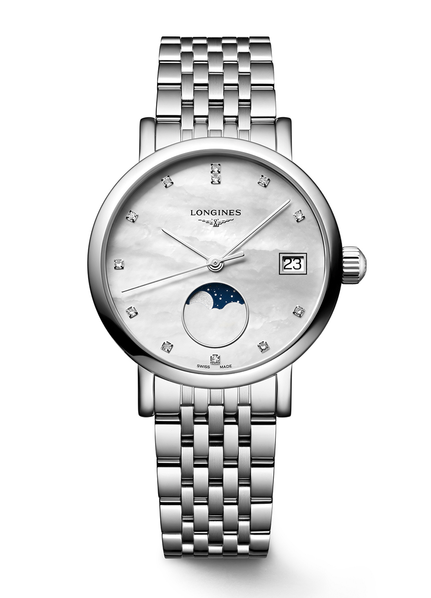 Longines Elegant Collection Moonphase – Kiểu dáng thiết kế tinh tế ẩn dấu sự thanh lịch vượt thời gian là đặc điểm nổi bật của bộ sưu tập quyến rũ này. Dòng sản phẩm tôn vinh sự thanh lịch thuần khiết, tối giản với nhiều kích cỡ, vật liệu và màu sắc dễ dàng kết hợp với nhiều bộ trang phục và sở thích.
