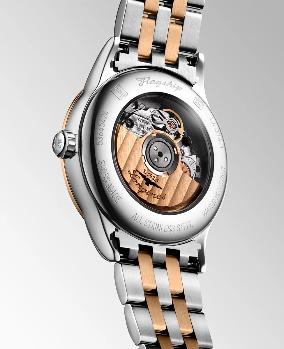 Bộ máy Longines Caliber L592 chuyển động cơ học tự động lên dây cót tốc độ 28'800 rung động mỗi giờ, với lò xo cân bằng silicon đơn tinh thể trữ cót lên đến 45 giờ. Mặt số đính 13 viên kim cương Top Wesselton VS-SI diamonds, tổng số 0.034 carats.