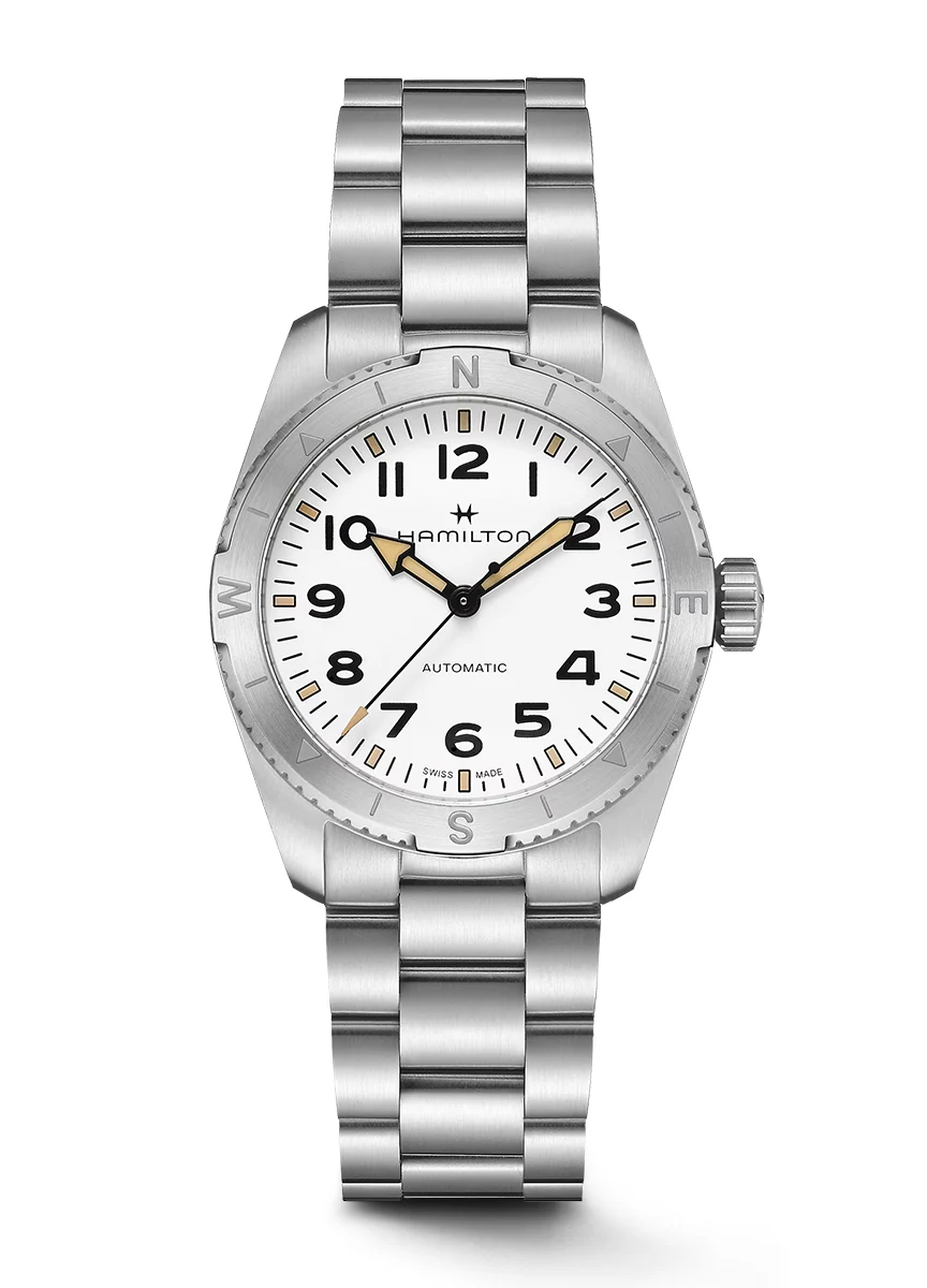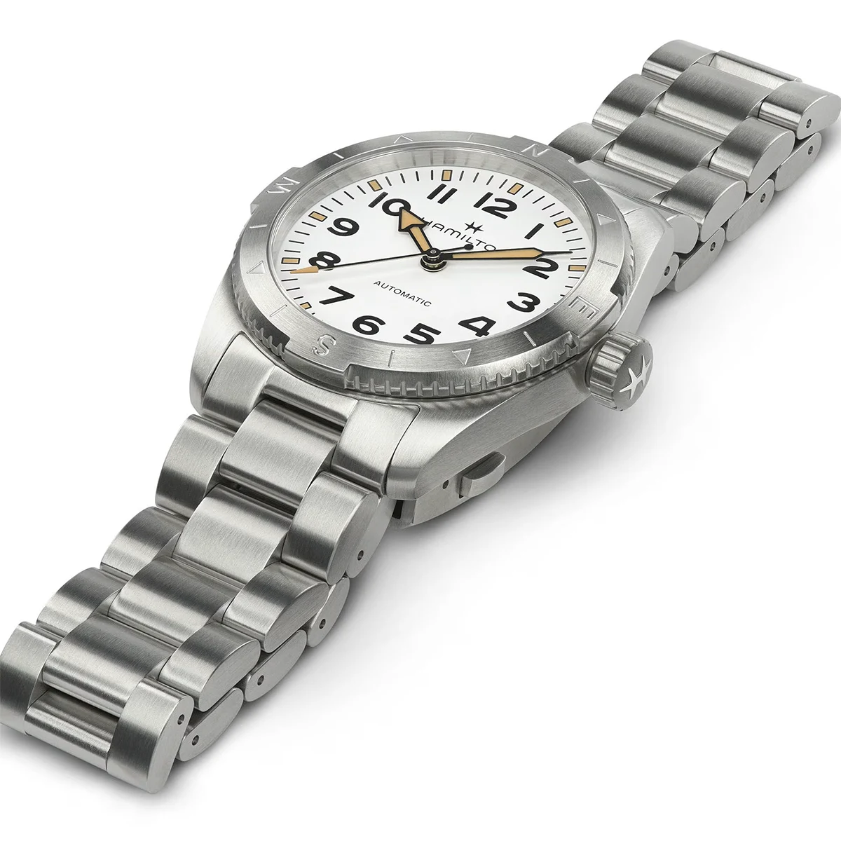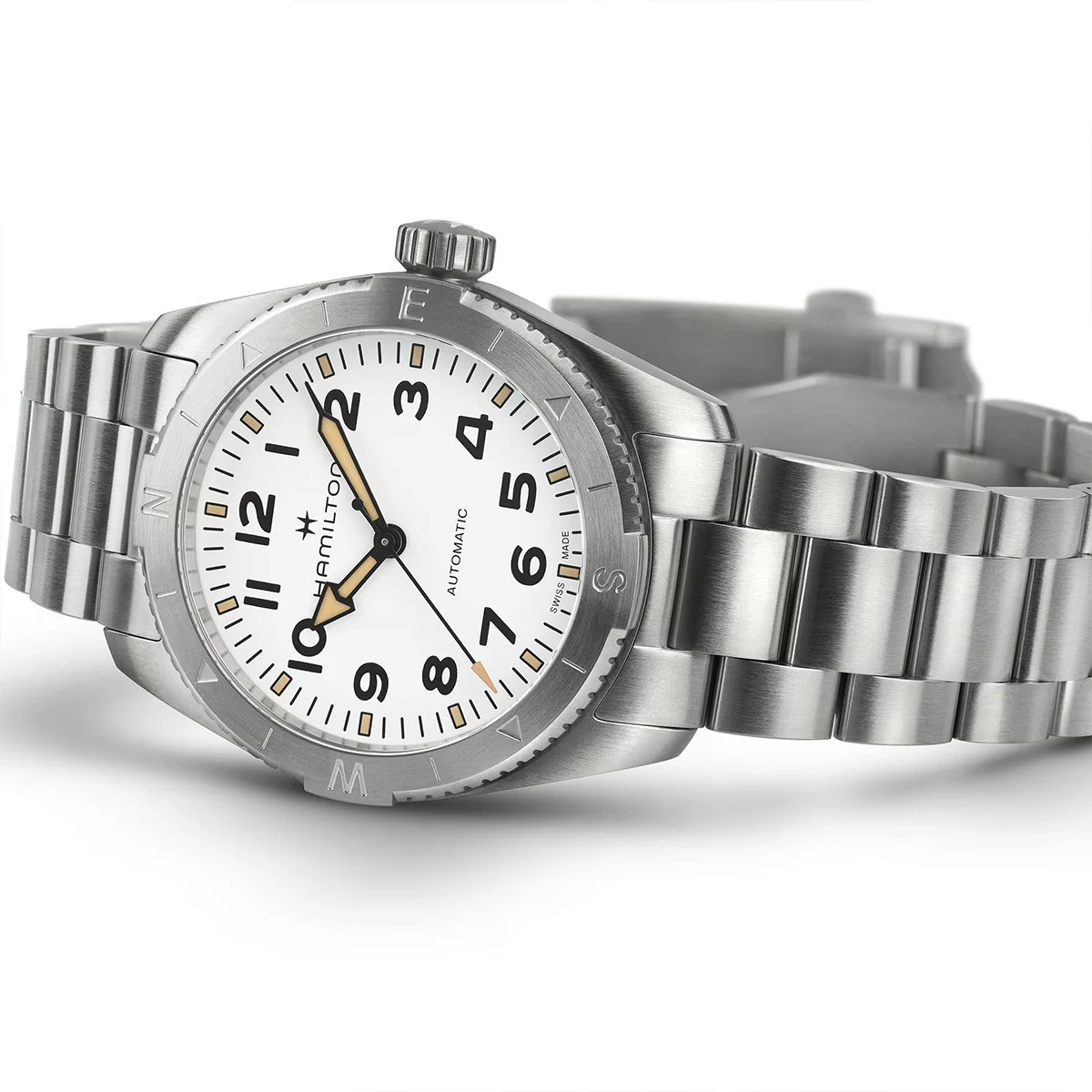 Hãy sẵn sàng cho những chuyến phiêu lưu ngoài trời tuyệt vời với Khaki Field Expedition, một chiếc đồng hồ phiêu lưu địa hình với thiết kế la bàn. Được đặt trong vỏ thép không gỉ 37mm kết hợp với dây đeo bằng thép 3 mắt xích và khóa gập, chiếc đồng hồ được trang bị núm vặn vặn chặt để bảo vệ bộ máy. Với mặt số phun cát trắng cho khả năng đọc giờ tối ưu, Khaki Field Expedition là chiếc đồng hồ bền bỉ nhất của bạn từ trước đến nay.